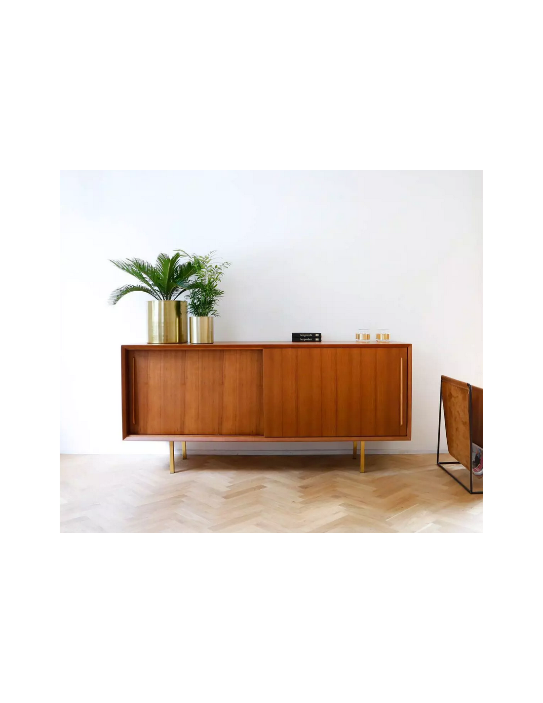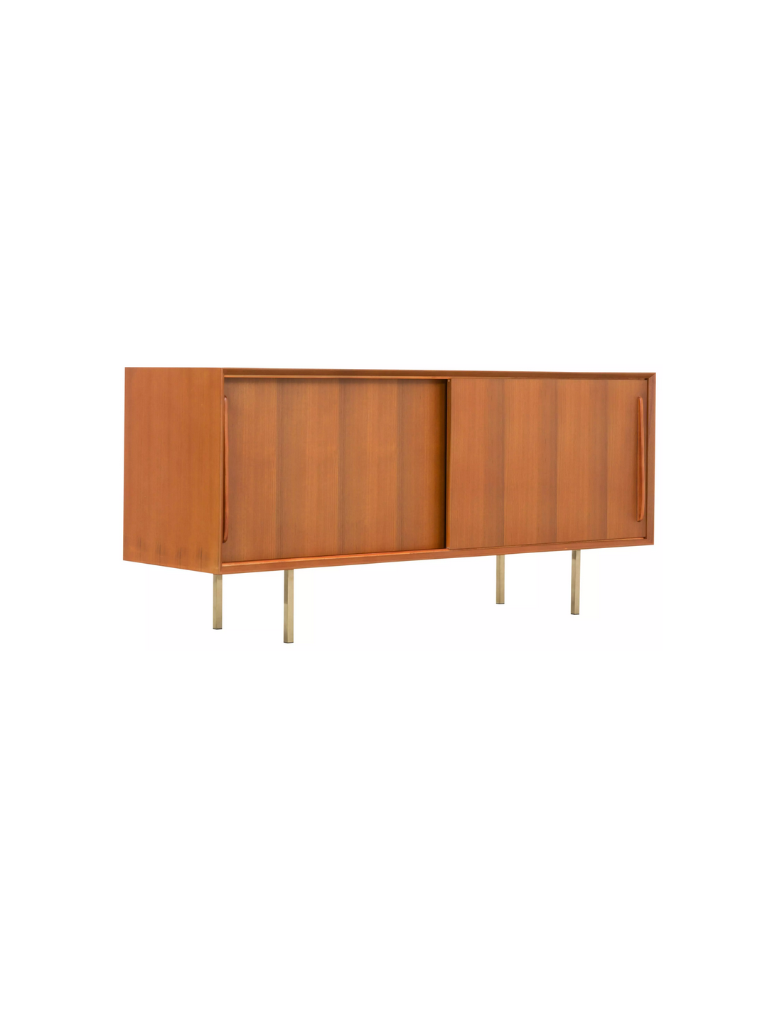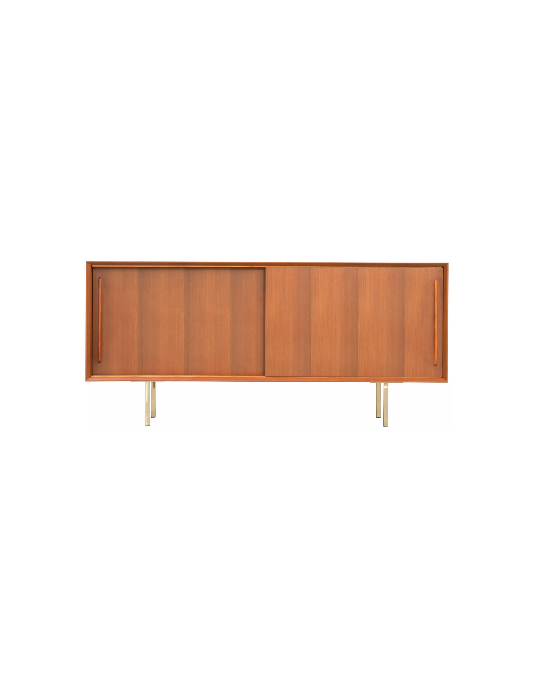Sideboard udført i et design af guldfarvet metal og teaktræsfinér. Sideboardet har justérbar hylde i hvert af de 2 rum, samt skydelåger. Møblet måler 69 cm i højden og 150 x 45 cm i bredde og dybde.