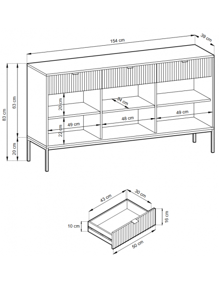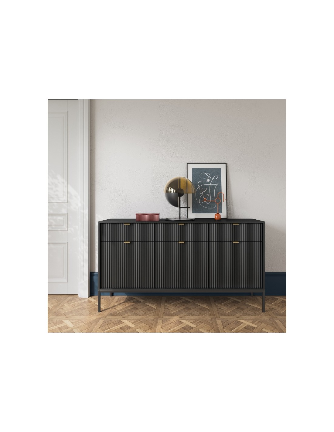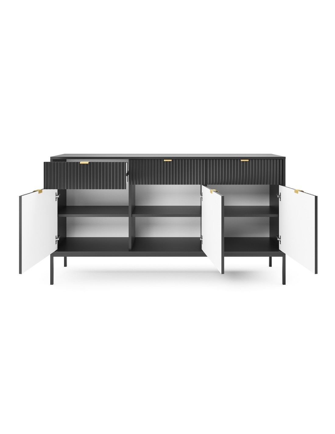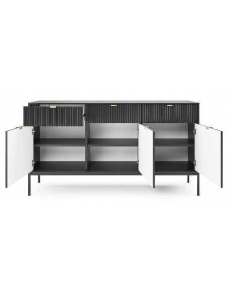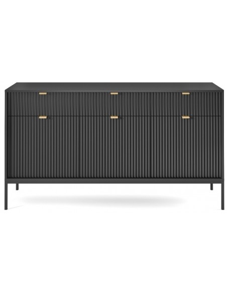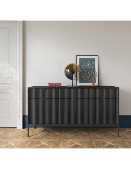 Nova sideboard udført i et design af sortlakeret metal og møbelplade med detaljer i guldfarvet metal. Sideboardet måler 83 cm i højden og 154 x 39 cm i bredde og dybde. Sideboardet indeholder 3 skuffer og 3 skabe.