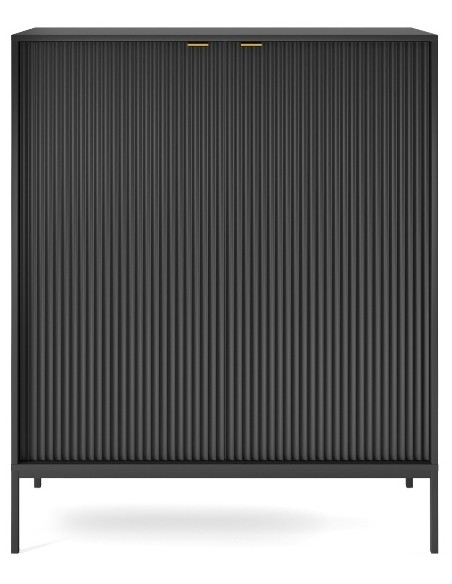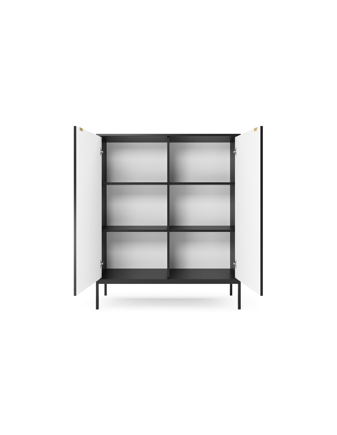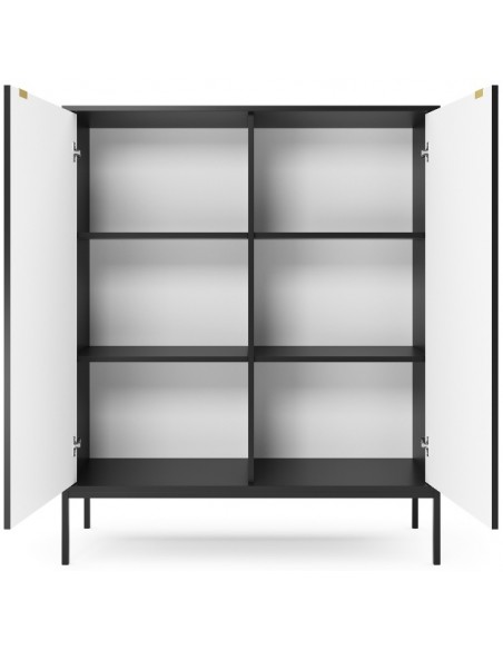 Nova highboard udført i et design af sortlakeret metal og møbelplade med detaljer i guldfarvet metal. Highboardet måler 125 cm i højden og 104 x 39 cm i bredde og dybde og indeholder 2 skabe.