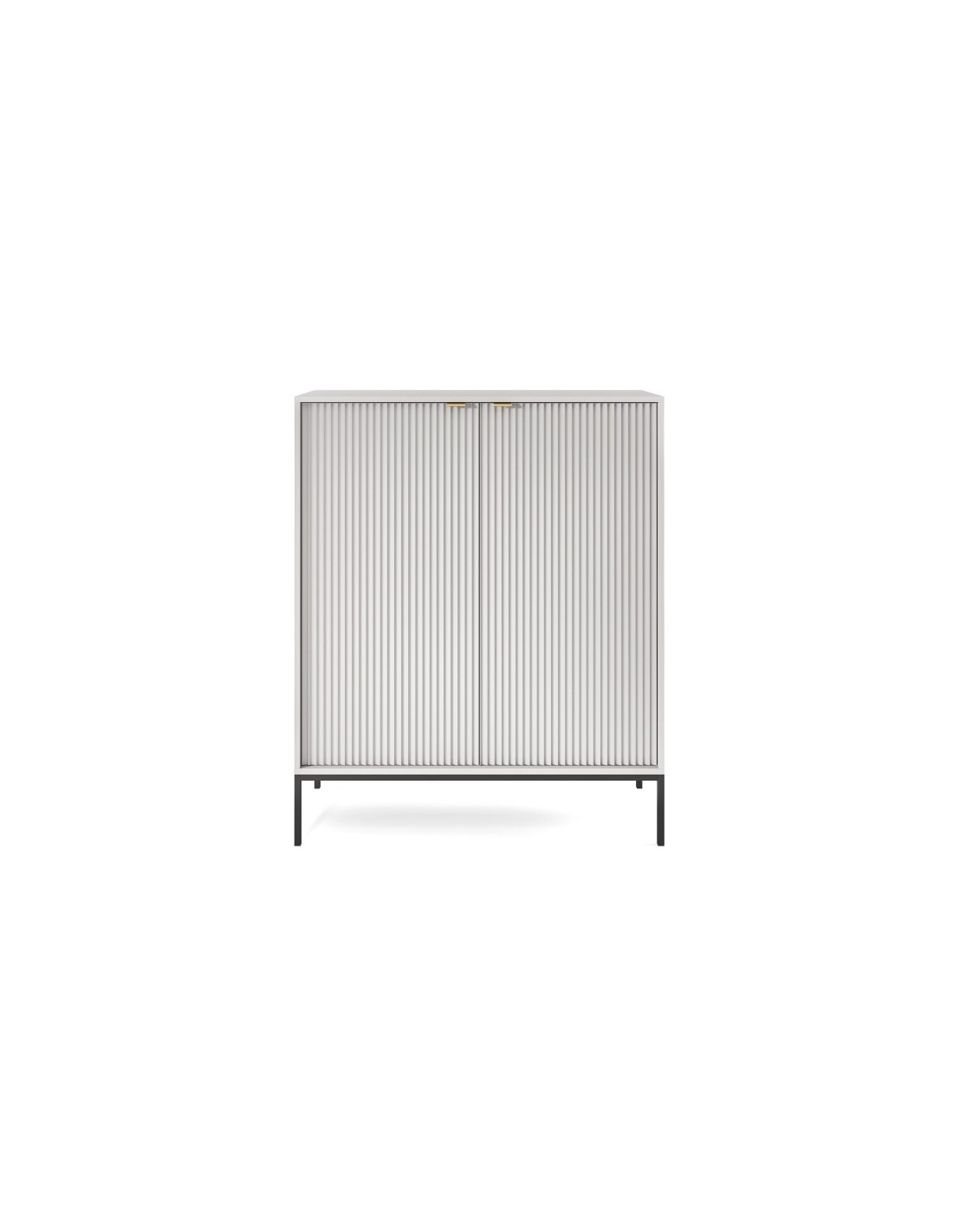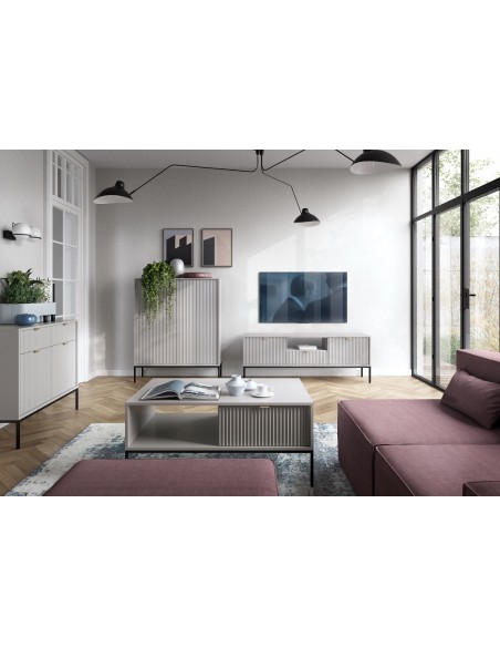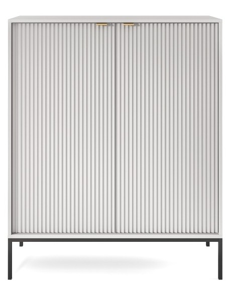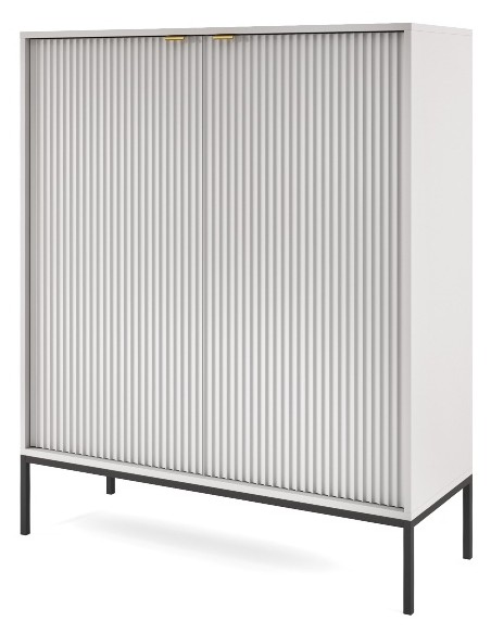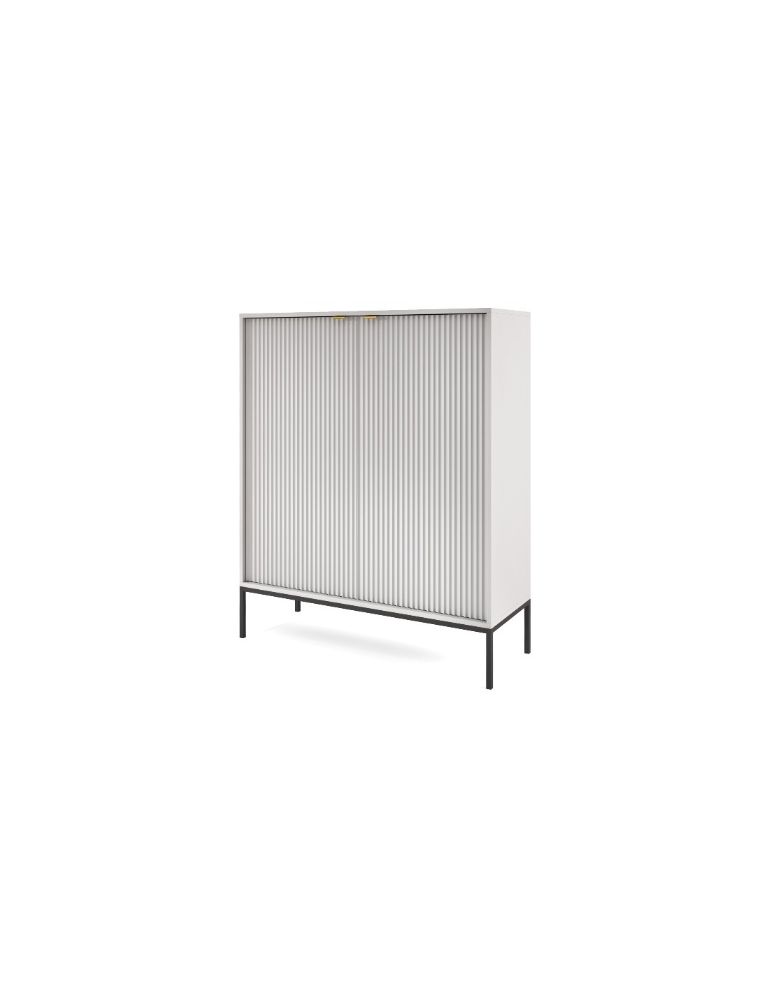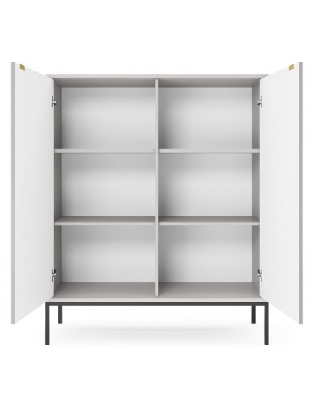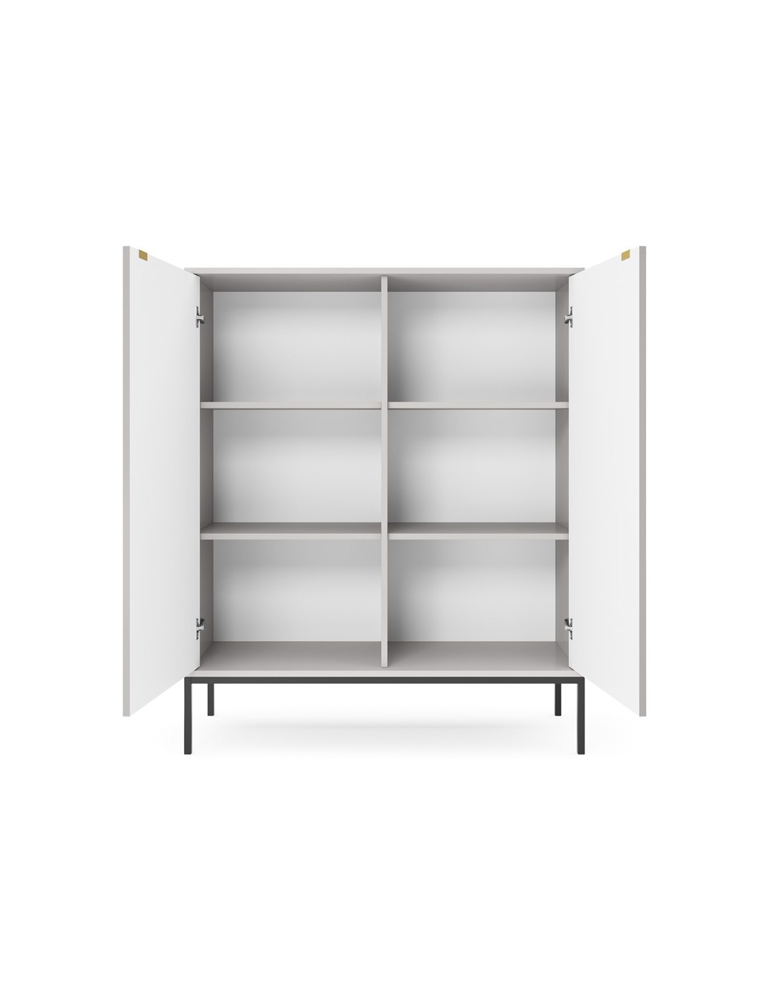 Nova highboard udført i et design af sortlakeret metal og grå møbelplade med detaljer i guldfarvet metal. Highboardet måler 125 cm i højden og 104 x 39 cm i bredde og dybde og indeholder 2 skabe.