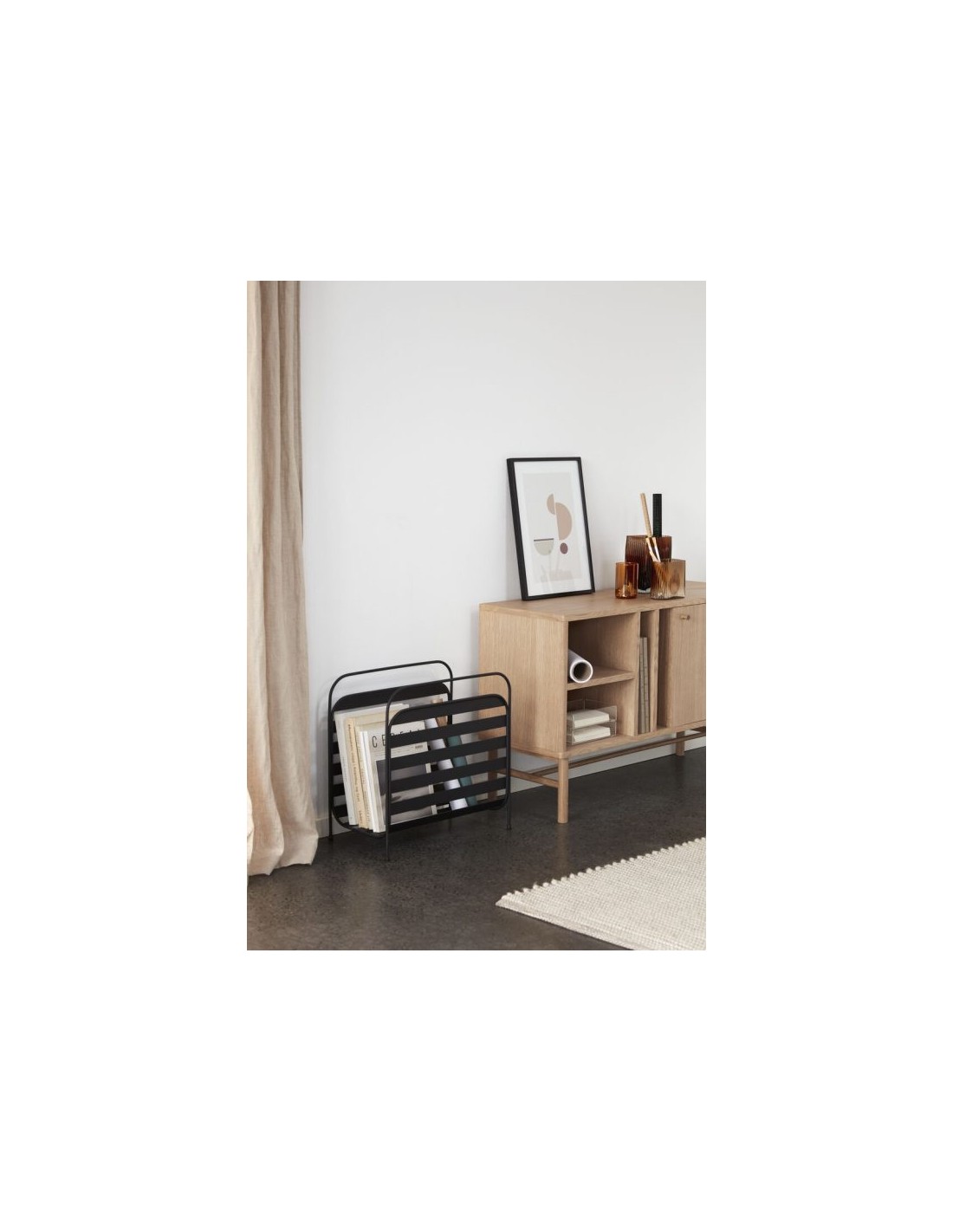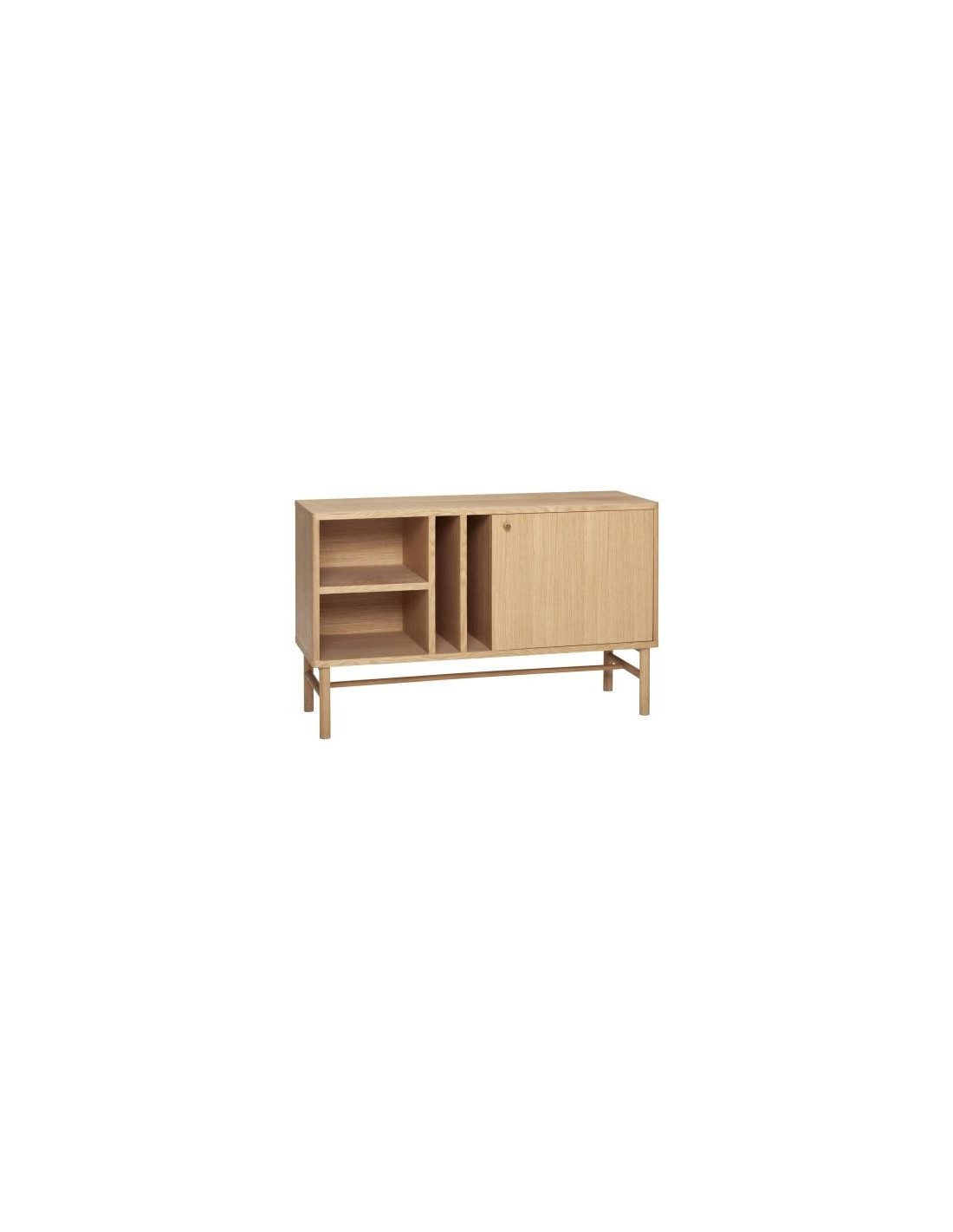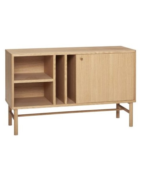 Hübsch Archive skænk udført i et design af egetræ og egetræsfinér. Skænken måler 62 cm i højden og 100 x 35 cm i bredde og dybde og indeholder 4 åbne hylderum samt 1 skab.