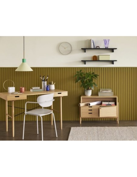 Hübsch Archive skænk udført i et design af egetræ og egetræsfinér. Skænken måler 60 cm i højden og 85 x 30 cm i bredde og dybde og indeholder 3 skuffer, 1 åbent hylderum samt 1 skab.