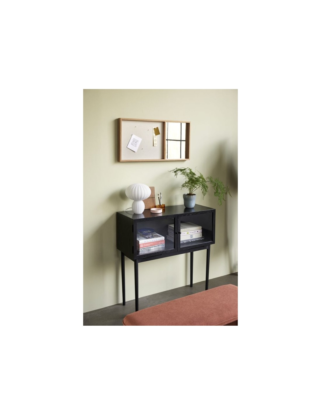Hübsch Museum skænk udført i et design af egetræ, egetræsfinér og glas. Skænken måler 90 cm i højden og 90 x 35 cm i bredde og dybde og indeholder 2 skabe.