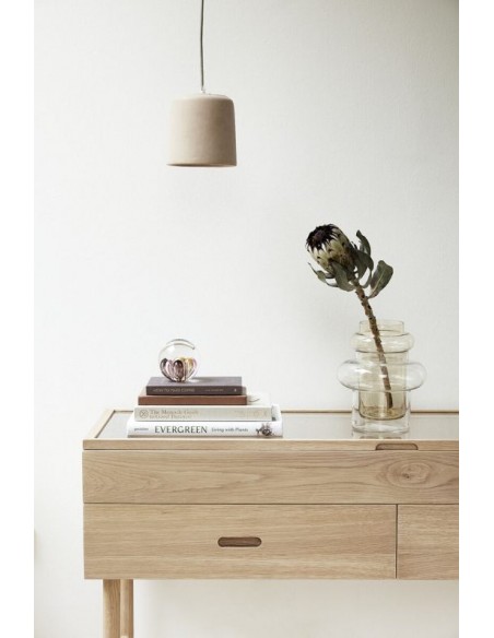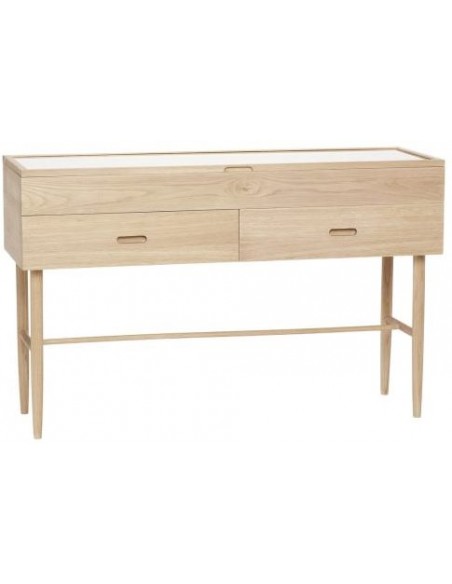Hübsch Treasure skænk udført i et design af egetræ og egetræsfinér samt glas. Skænken måler 75 cm i højden og 120 x 40 cm i bredde og dybde. Skænken har 2 skuffer samt 1 opbevaringsrum med topplade i glas.