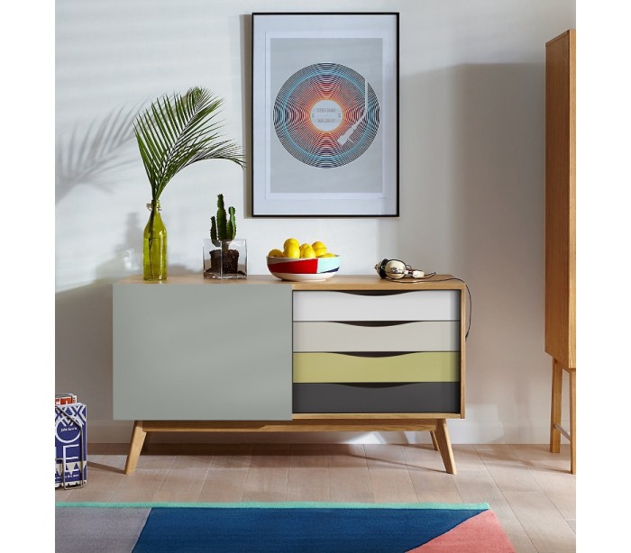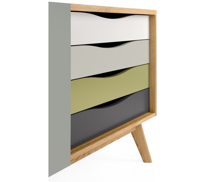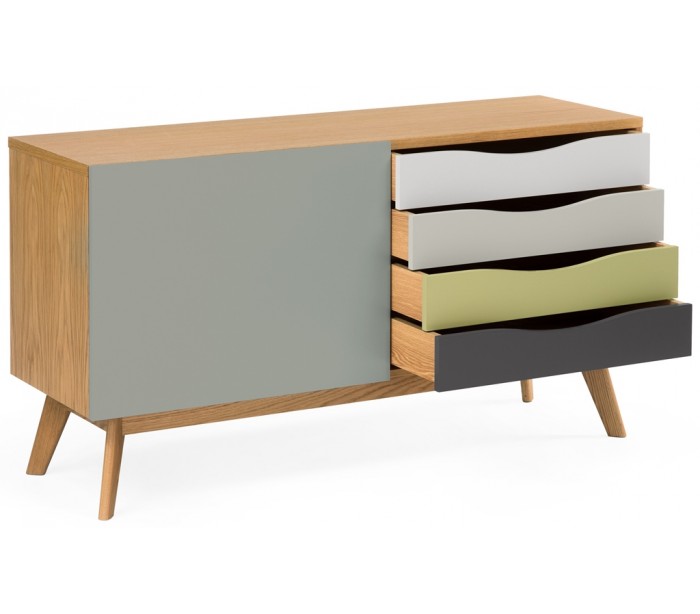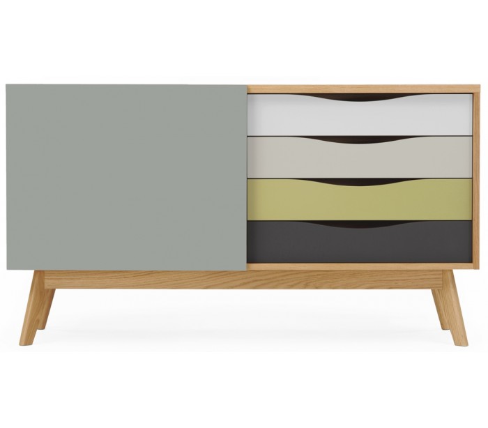 Avon sideboard i et retropræget design, med ben fremstillet i massiv eg og krop i egefinér. Skuffer og skydelåge er fremstillet i malet melamin. Et sideboard i et smukt og iøjefaldende design.