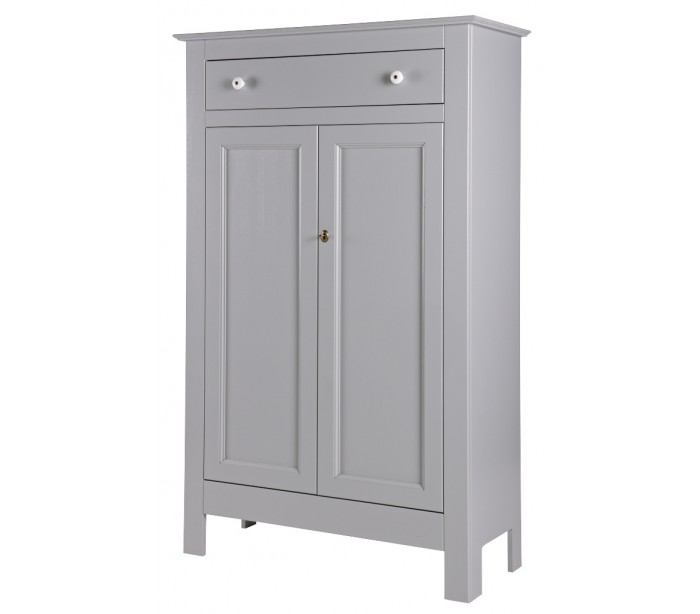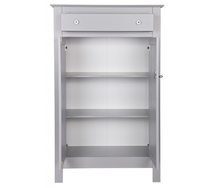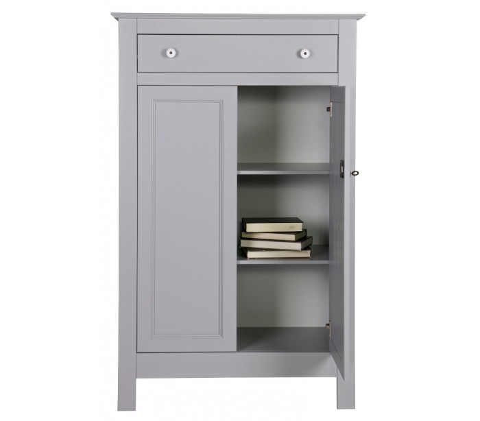 Kabinet i et moderne design, fremstillet i betongråt lakeret fyrretræ. Kabinettet indeholder 2 skabe med 2 tværgående hylder, samt skuffe. Kabinettet måler 150 cm i højden og 93 x 40 cm i bredde og dybde.