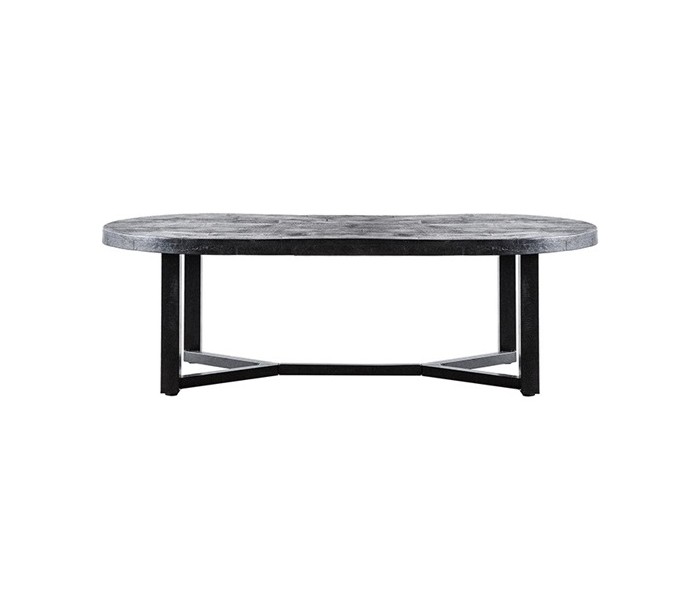 Ovalt sofabord i et rustikt design, fremstillet i sortlakeret mangotræ og sortlakeret metal. Sofabordet måler 45 cm i højden og 140 x 70 cm i bredde og dybde.