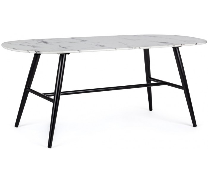 Sofabord i et moderne design, fremstillet med bordplade i hvid marmor og med ben i sortlakeret metal. Sofabordet måler 45 cm i højden og 110 x 50 cm i bredde og dybde.