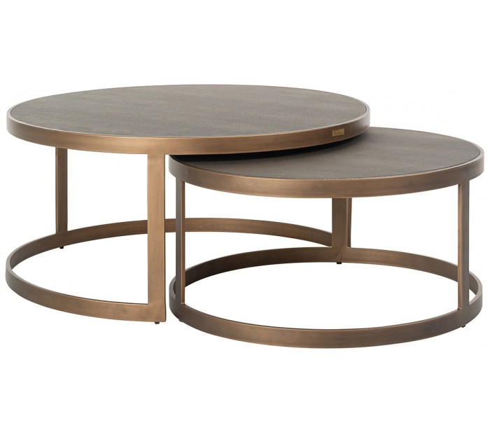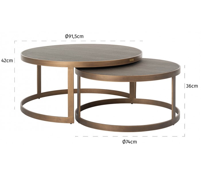 Sofaborde i et design fra hollandske Richmond Interiors. Bordene er fremstillet i antik guldfarvet stål og brun vegansk læder og måler 74 + 91,5 cm i diameter og 36 + 42 cm i højden.