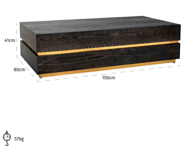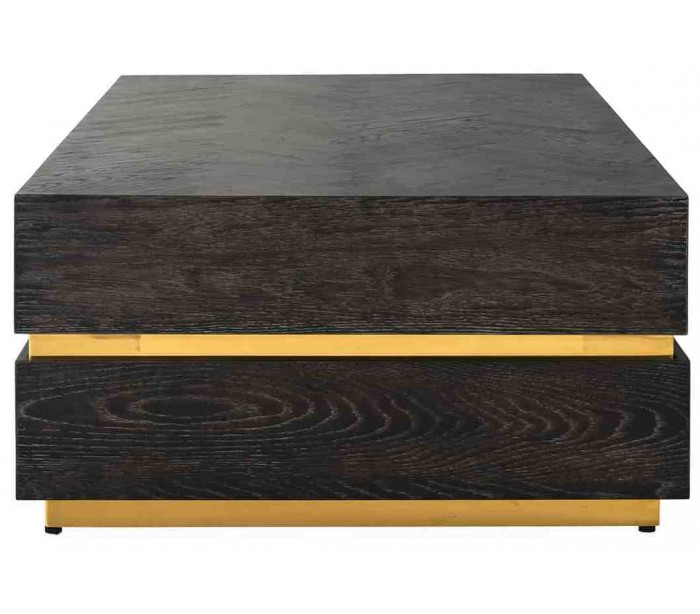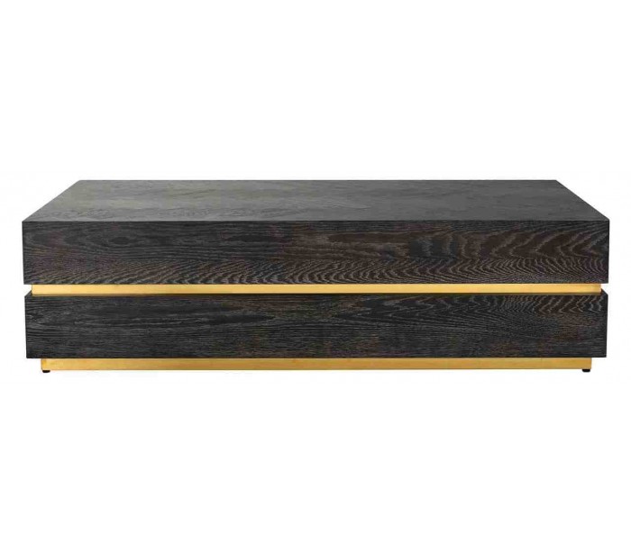 Sofabord i et design fra hollandske Richmond Interiors. Bordet er fremstillet i sortlakeret egetræ og med detaljer i guldfarvet stål og måler 150 x 80 cm i bredde og dybde og 41 cm i højden.