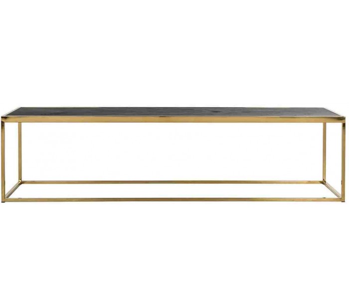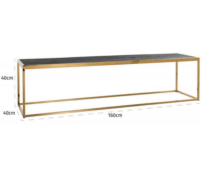 Sofabord i et design fra hollandske Richmond Interiors. Bordet er fremstillet i sortlakeret egetræ og guldfarvet stål og måler 160 x 40 cm i bredde og dybde og 40 cm i højden.