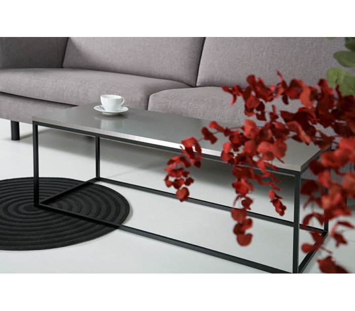 Sofabord i et design fremstillet med bordplade i stålbelagt mdf og stel i lakeret metal. Sofabordet måler 110 x 45 cm i bredde og dybde og 40 cm i højden.