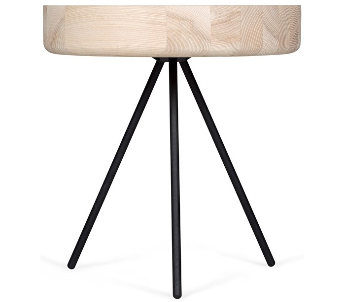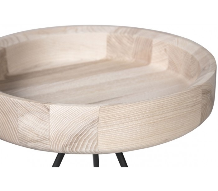 Sofabord i et design fremstillet med bordplade i ask træ og stel i lakeret metal. Sofabordet måler 40 cm i diameter og 43 cm i højden.