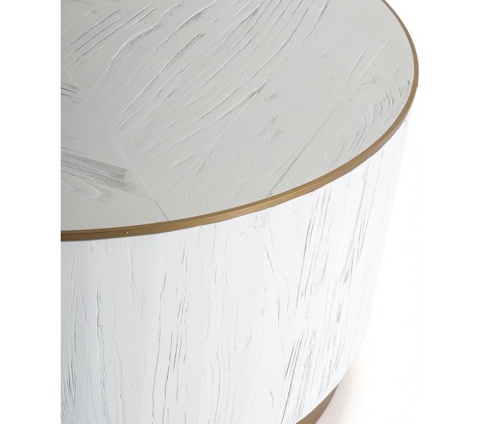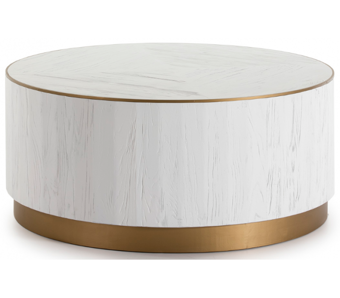 Sofabord udført i et let moderne, men rustikt design i antik guldfarvet metal og antik hvidbejset træ. Sofabordet måler 100 cm i diameter og 45 cm i højden. Det anbefales at anvende bordskånere ved meget varme krus eller fugtige glas o.lign.