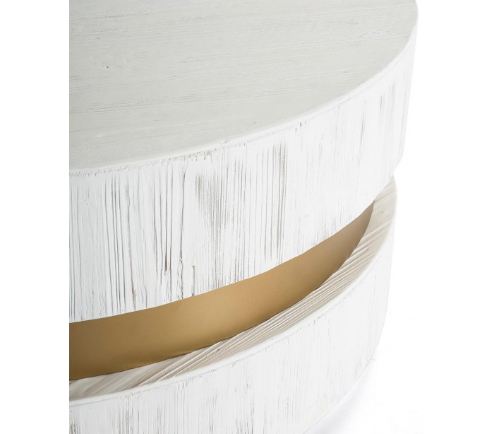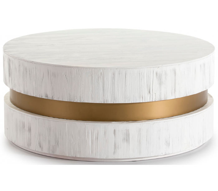 Sofabord udført i et let moderne, men rustikt design i antik guldfarvet metal og antik hvidbejset træ. Sofabordet måler 100 cm i diameter og 43 cm i højden. Det anbefales at anvende bordskånere ved meget varme krus eller fugtige glas o.lign.