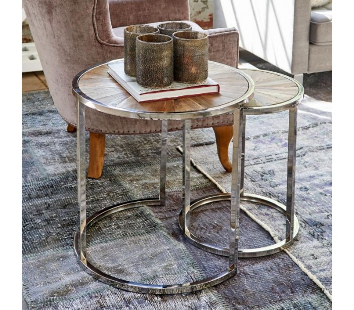 Sofaborde fra Riviera Maison, udført i et rustikt design af massiv genanvendt egetræ og rustfri stål. Sofabordene måler 50/56 cm i højden og 40/55 cm i diameter.