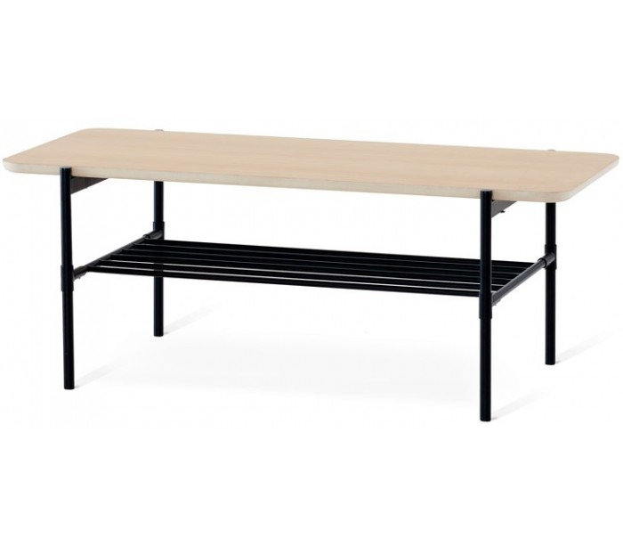 Sofabord i et moderne design, fremstillet med stel i sortlakeret metal og bordplade i hvidolieret egetræsfinér. Bordet måler 135 x 65 cm i bredde og dybde og 52 cm i højden.