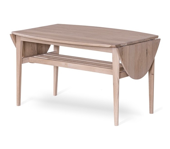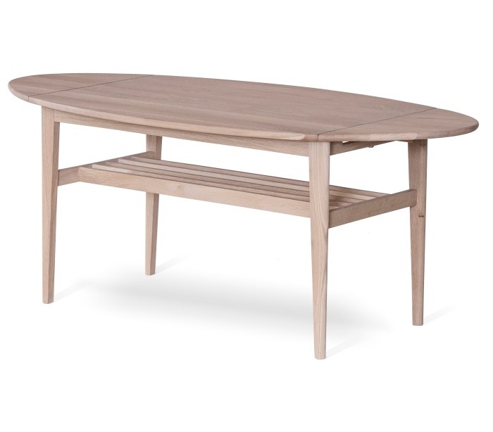 Sofabord i et moderne design, fremstillet i hvidolieret egetræ. Bordet måler 90 - 140 x 69 cm i bredde og dybde og 55 cm i højden.