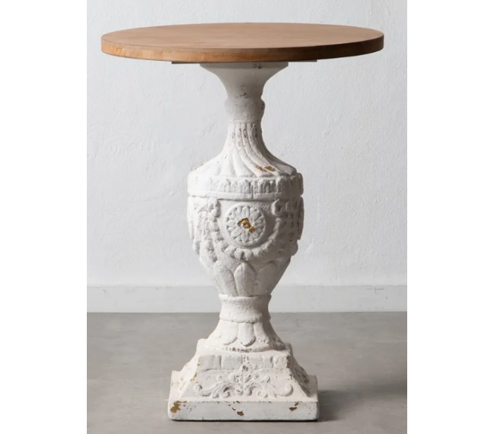 Sidebord udført i et design af antik hvidlakeret polyresin og rustik naturfarvet fyrretræ. Bordet måler 76 cm i højden og 45 cm i diameter.