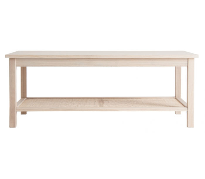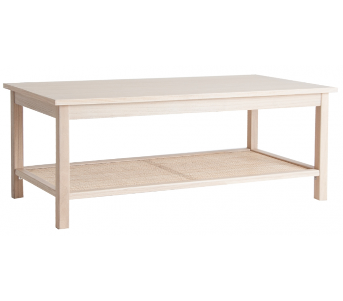 Sofabord udført i et design af let lakeret fyrretræ, mdf og med hylde i fiberrattan. Sofabordet måler 46 cm i højden og 120 x 60 cm i bredde og dybde.