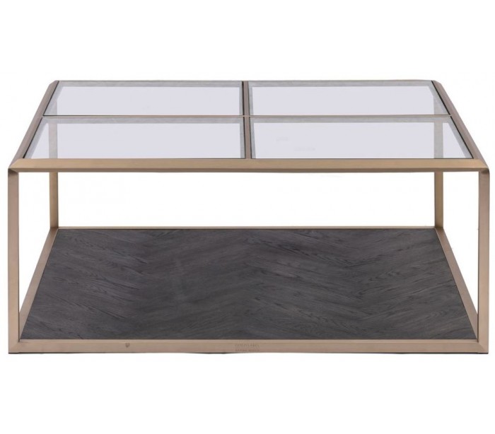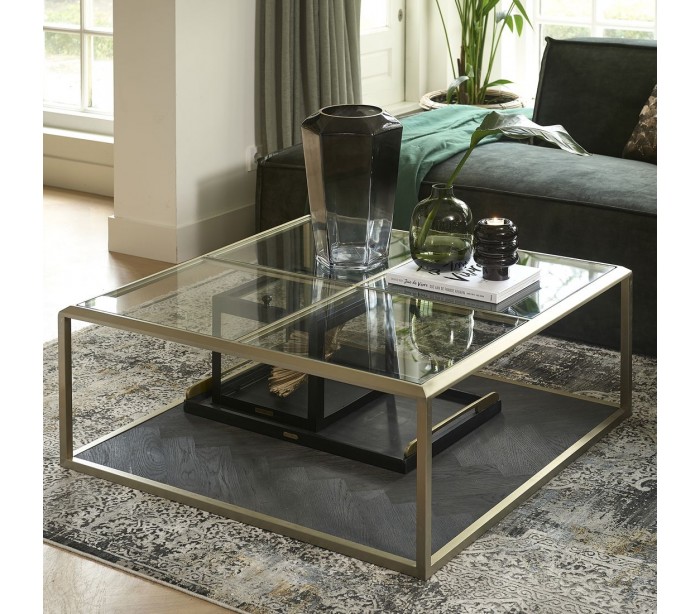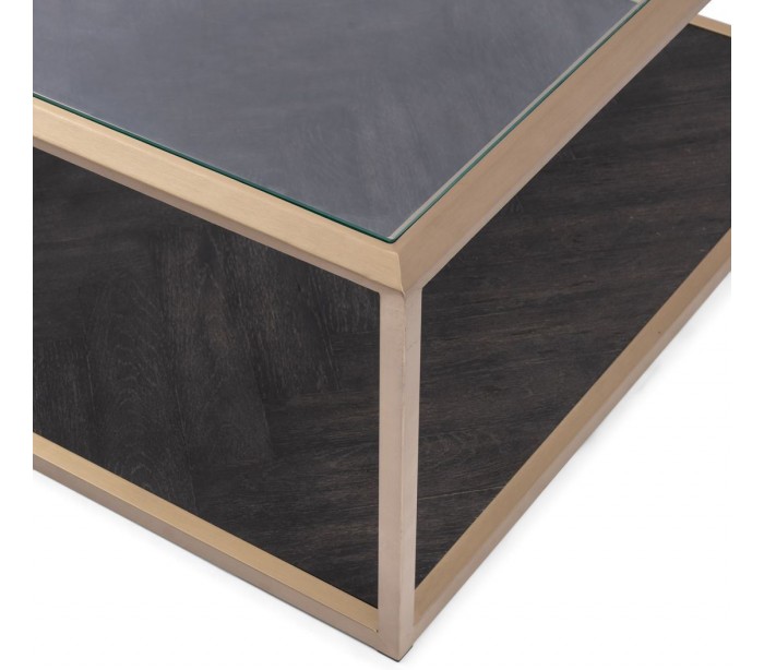 Sofabord fra Riviera Maison, udført i et design af kaffefarvet stål, hærdet glas og sortbrun bejset egetræ. Sofabordet måler 37 cm i højden og 90 x 90 cm i bredde og dybde.