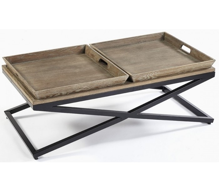 Sofabord udført i et rustikt design i antik sortlakeret metal og pigmenteret aldret egetræ. Sofabordet måler 120 x 65 cm i bredde og dybde og 45 cm i højden (inklusiv bakkerne). Bakkerne kan tages af.