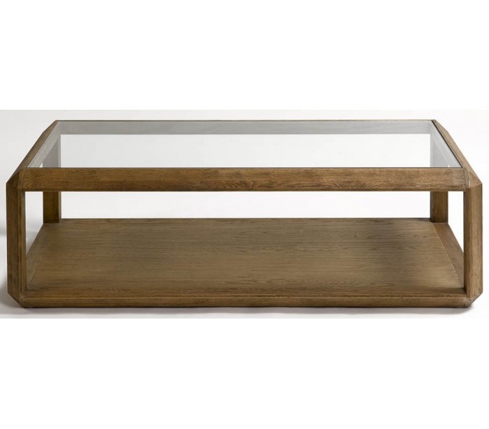 Sofabord udført i et design i børstet egetræ og klart glas. Sofabordet måler 140 x 70 cm i bredde og dybde og 42 cm i højden.