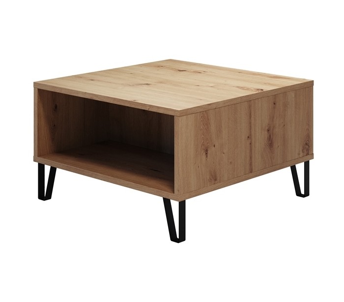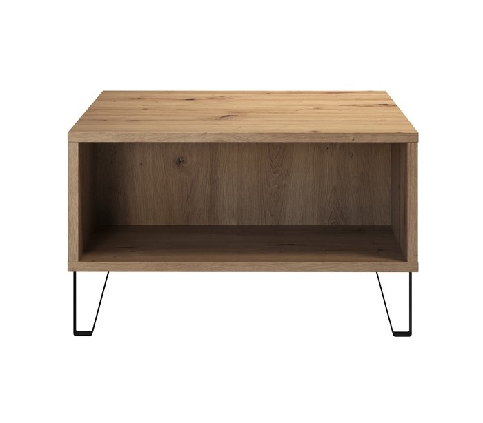 Sofabord med hylderum, udført i et design af sortlakeret metal og vild egetræsfarvet møbelplade. Sofabordet måler 37 cm i højden og 60 x 60 cm i bredde og dybde.