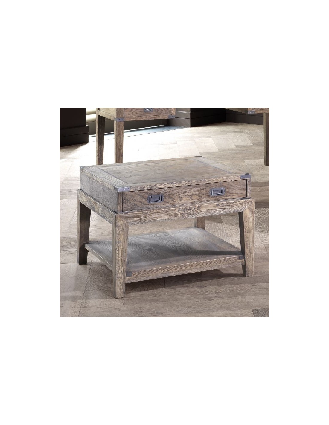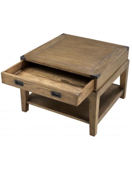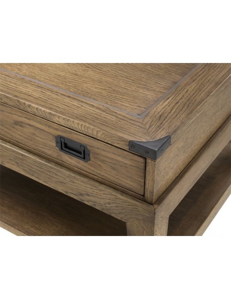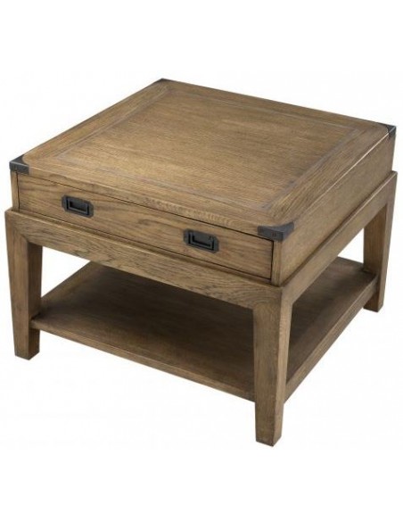 Eichholtz Military sofabord i et moderne design af røget egetræ og med detaljer i gunmetal lakeret metal. Sofabordet måler 50,5 cm i højden og 67,5 x 67,5 cm i bredde og dybde. Sofabordet indeholder 1 skuffe og 1 opbevaringshylde.