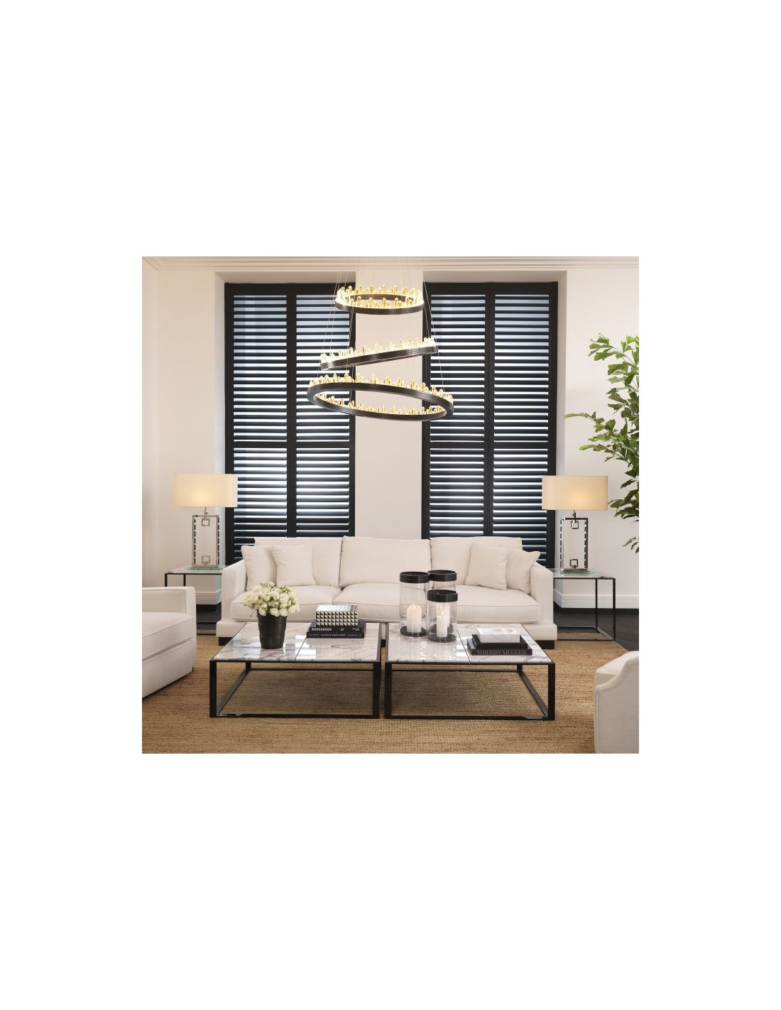 Eichholtz San Ramon sofabord udført i et moderne design af sort højglans lakeret stål og gråhvid marmor. Sofabordet måler 35 cm i højden og 100 x 100 cm i bredde og dybde.