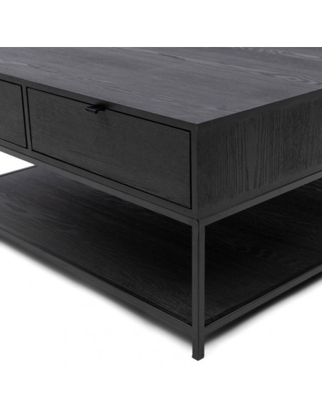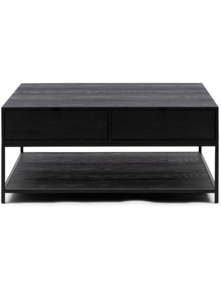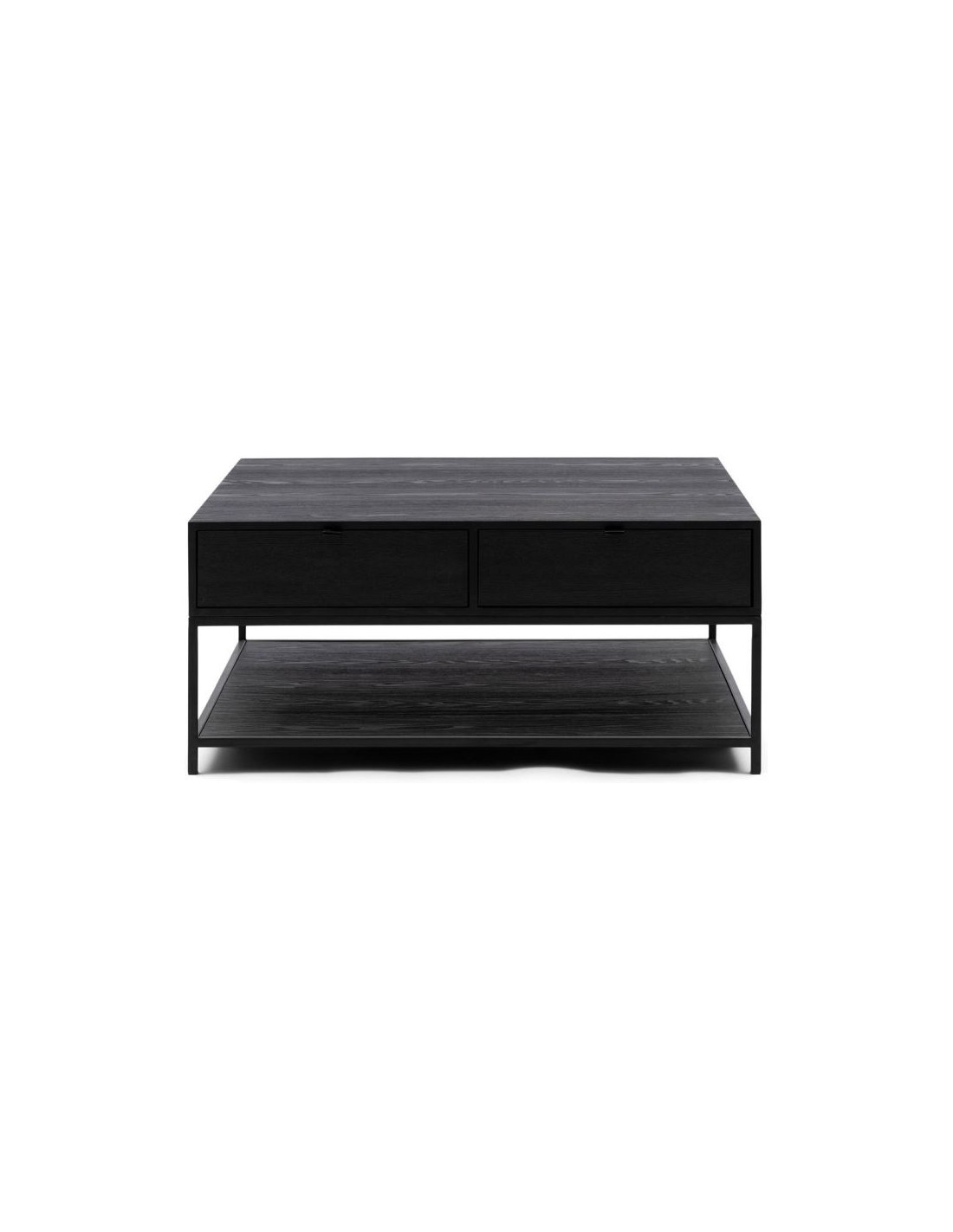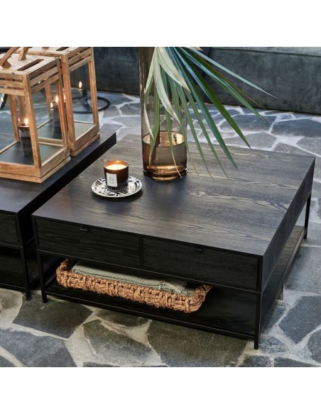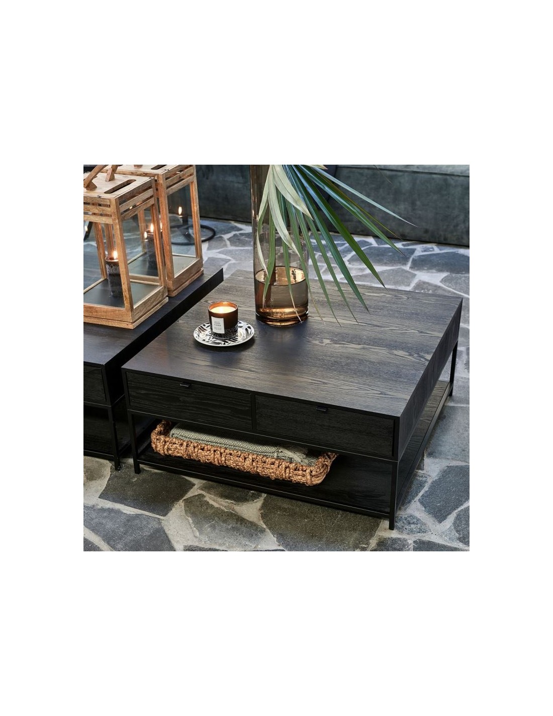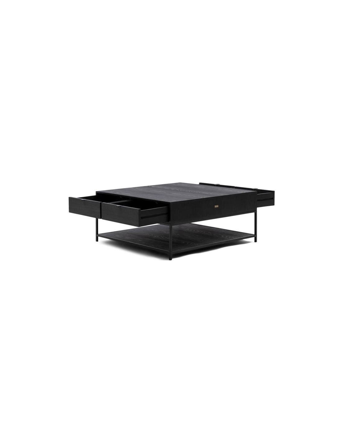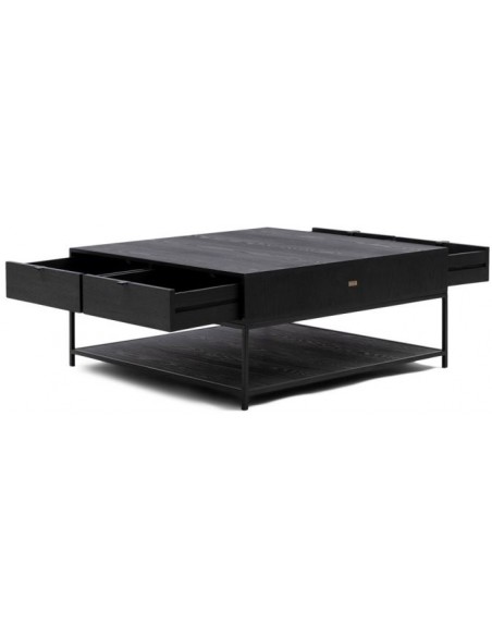 Riviera Maison sofabord, udført i et design af sortlakeret askfinér og sortlakeret metal. Sofabordet er med 4 skuffer på metalskinner. Sofabordet måler 40 cm i højden og 90 x 90 cm i bredde og dybde.