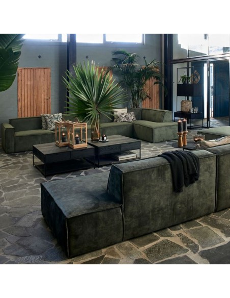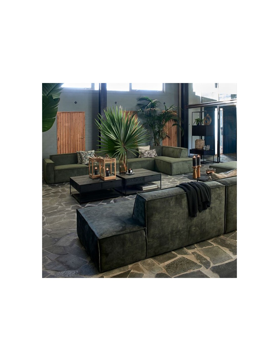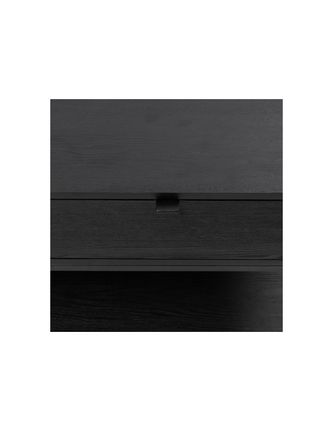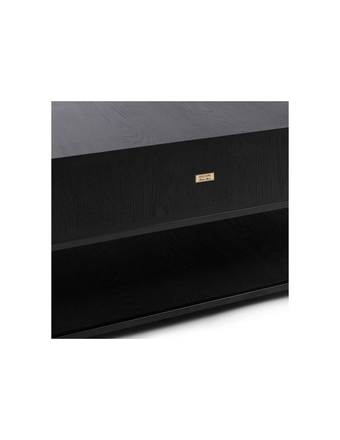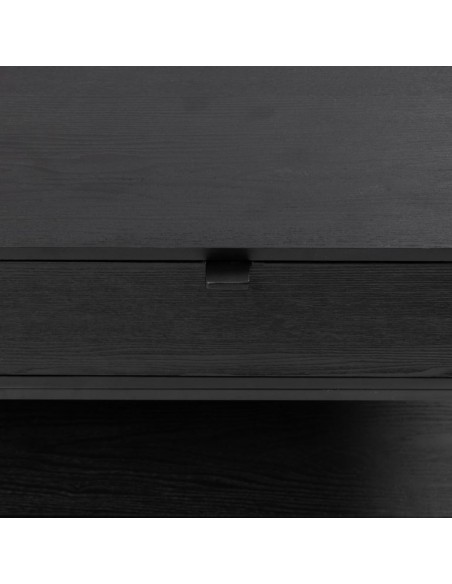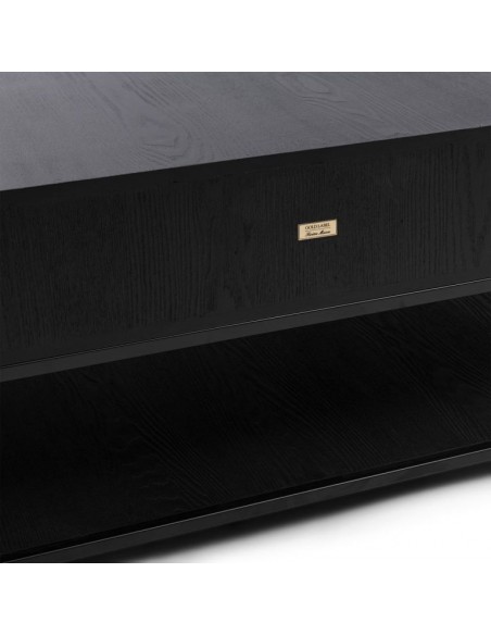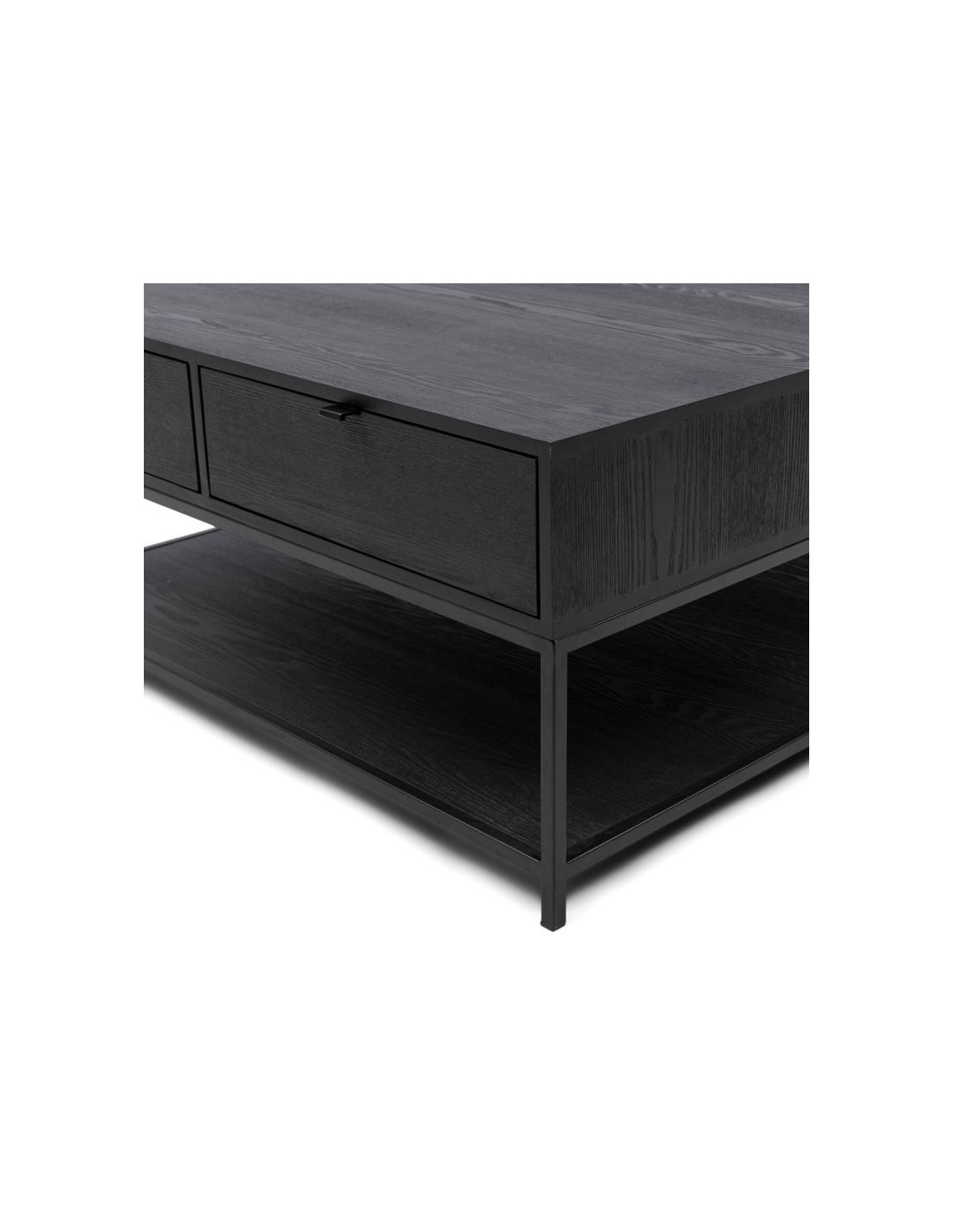 Riviera Maison sofabord, udført i et design af sortlakeret askfinér og sortlakeret metal. Sofabordet er med 4 skuffer på metalskinner. Sofabordet måler 40 cm i højden og 90 x 90 cm i bredde og dybde.