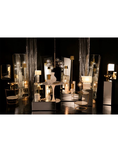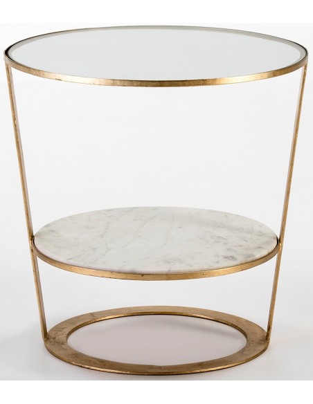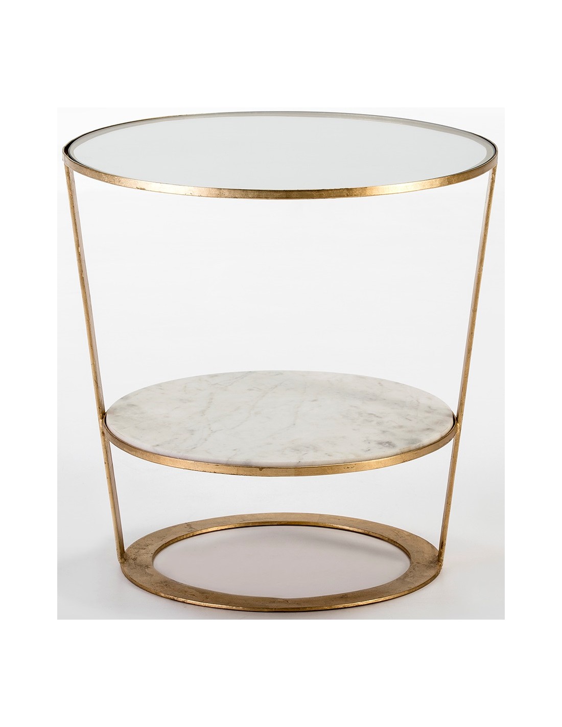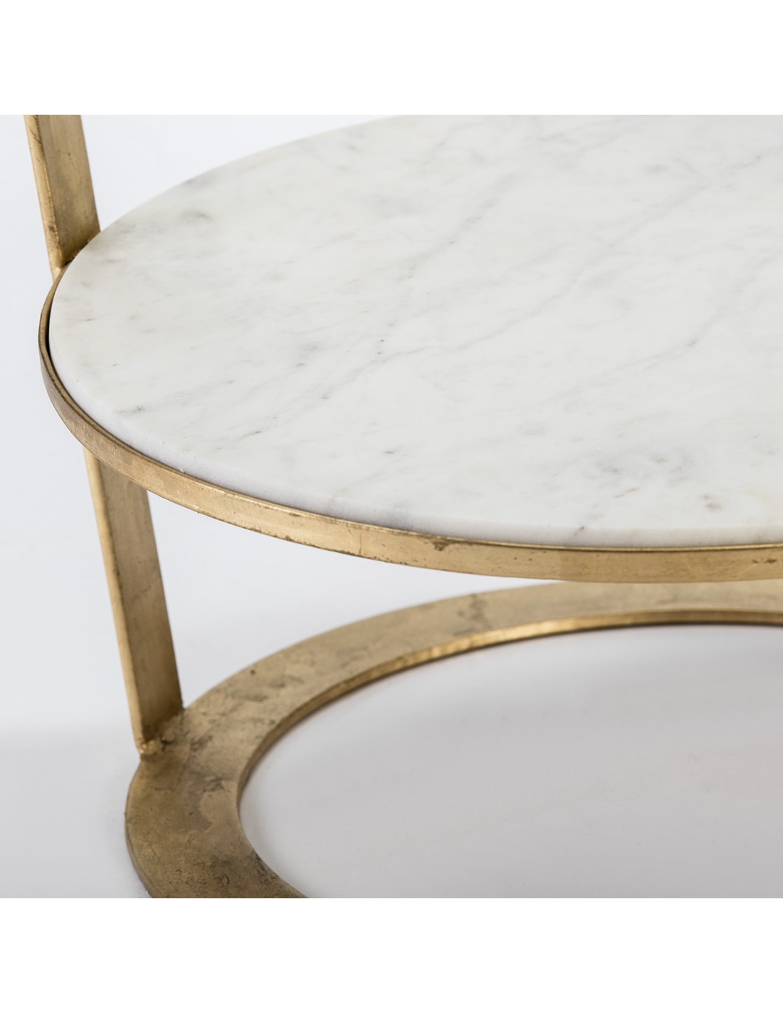 Sofabord udført i et design i antik gylden lakeret metal med bordplader i klart glas og hvid marmor. Sofabordet måler 56 cm i diameter og 56 cm i højden.