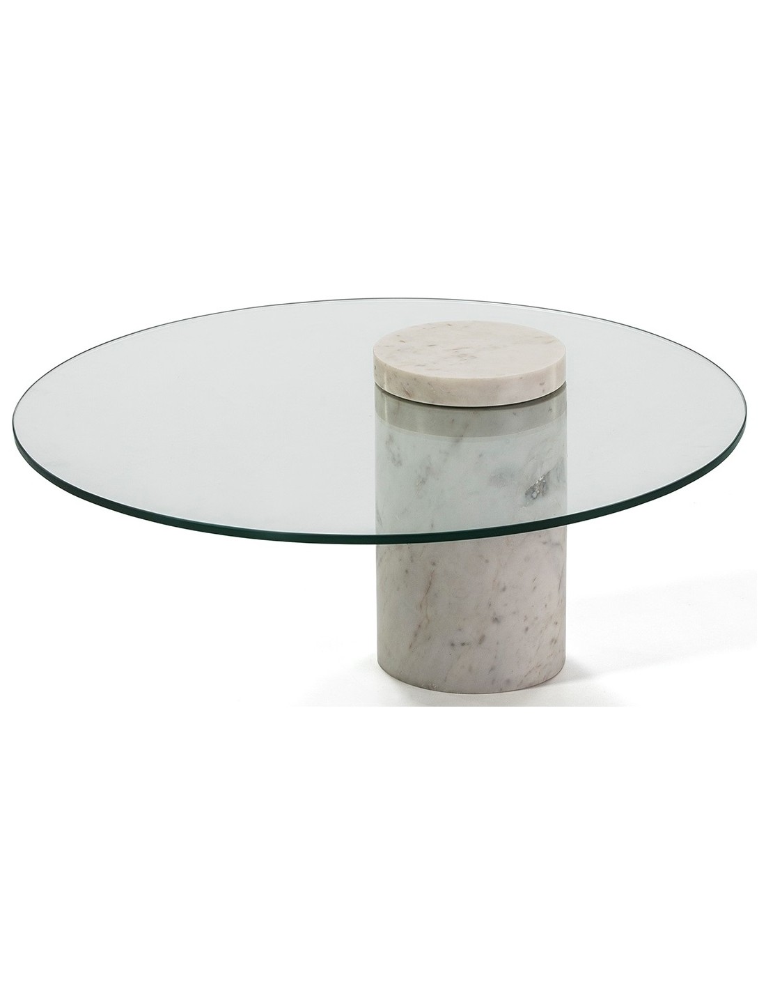 Sofabord udført i et design i klart glas og hvid marmor. Sofabordet måler 76 cm i diameter og 32 cm i højden.