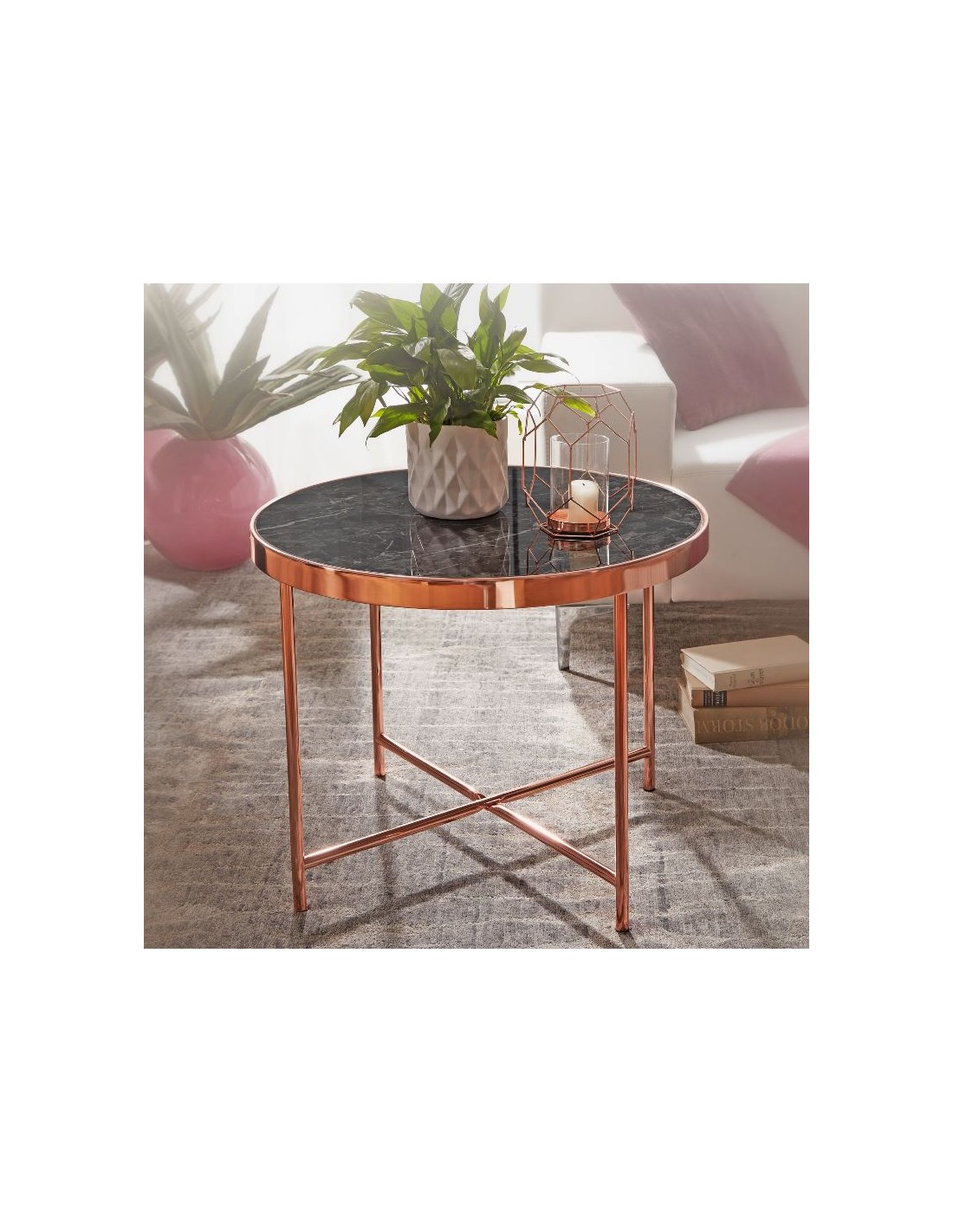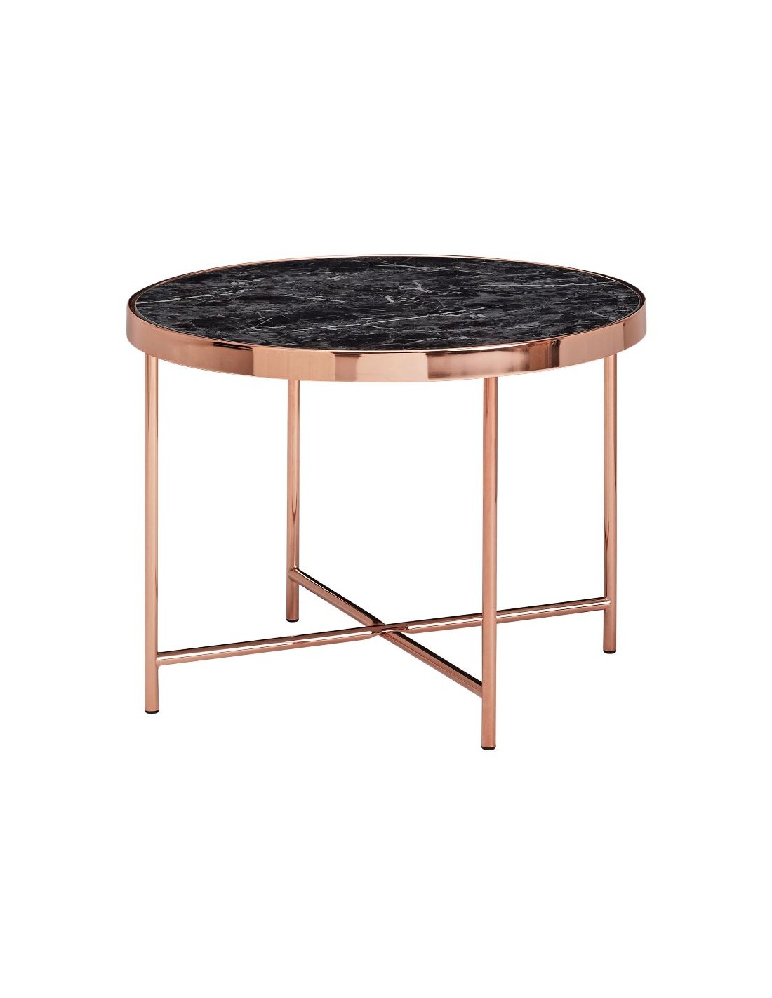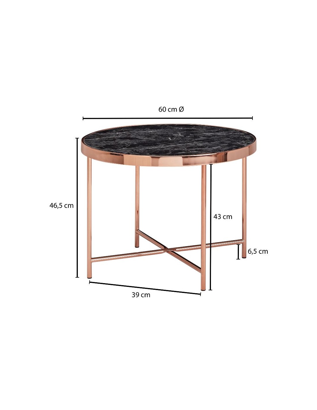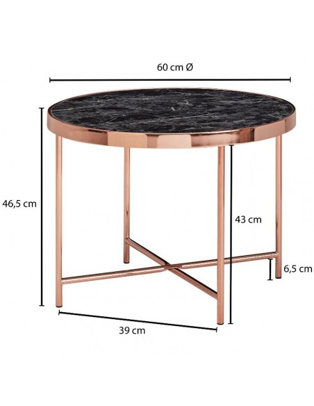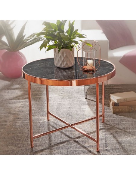 Sofabord fremstillet i kobberfarvet metal og marmoriseret sort glas. Bordet måler 60 cm i diameter og 46,5 cm i højden.
