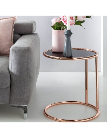 Sofabord fremstillet i kobberfarvet metal og sort glas med spejleffekt. Bordet måler 45 cm i diameter og 53 cm i højden.