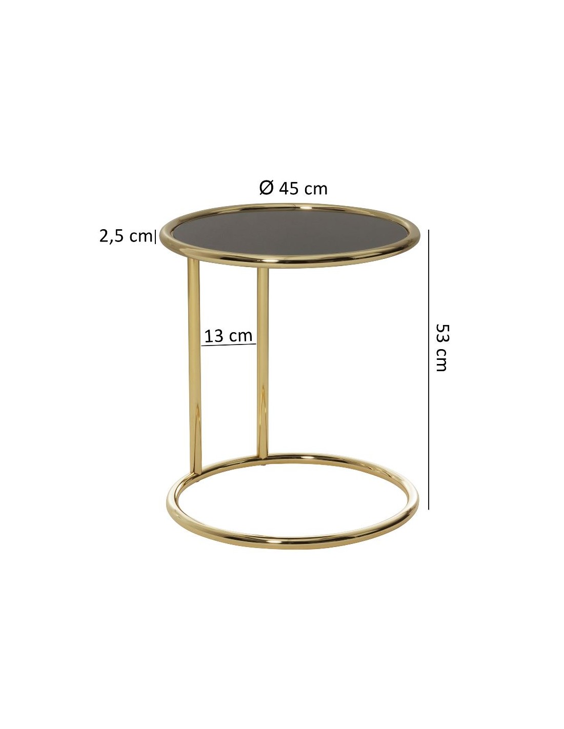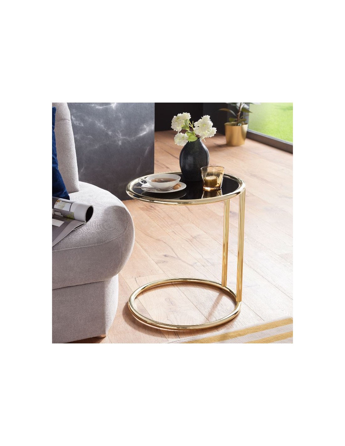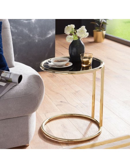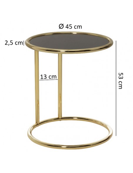 Sofabord fremstillet i guldfarvet metal og sort glas med spejleffekt. Bordet måler 45 cm i diameter og 53 cm i højden.