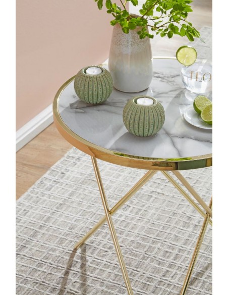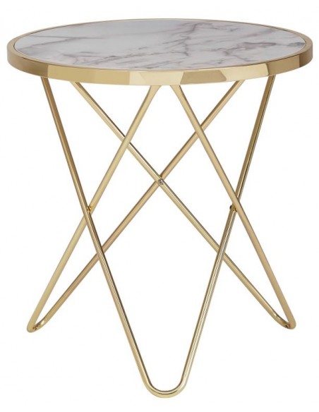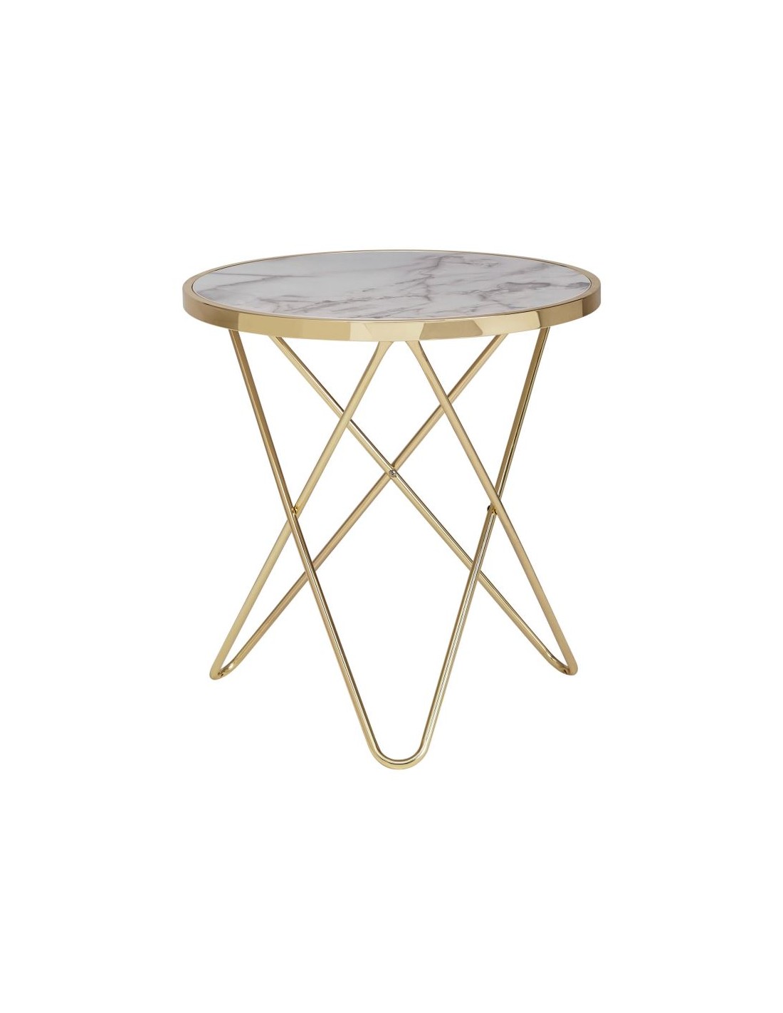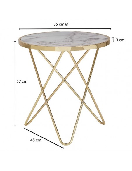 Sofabord fremstillet i guldfarvet metal og marmoriseret hvid mdf. Bordet måler 55 cm i diameter og 57 cm i højden.