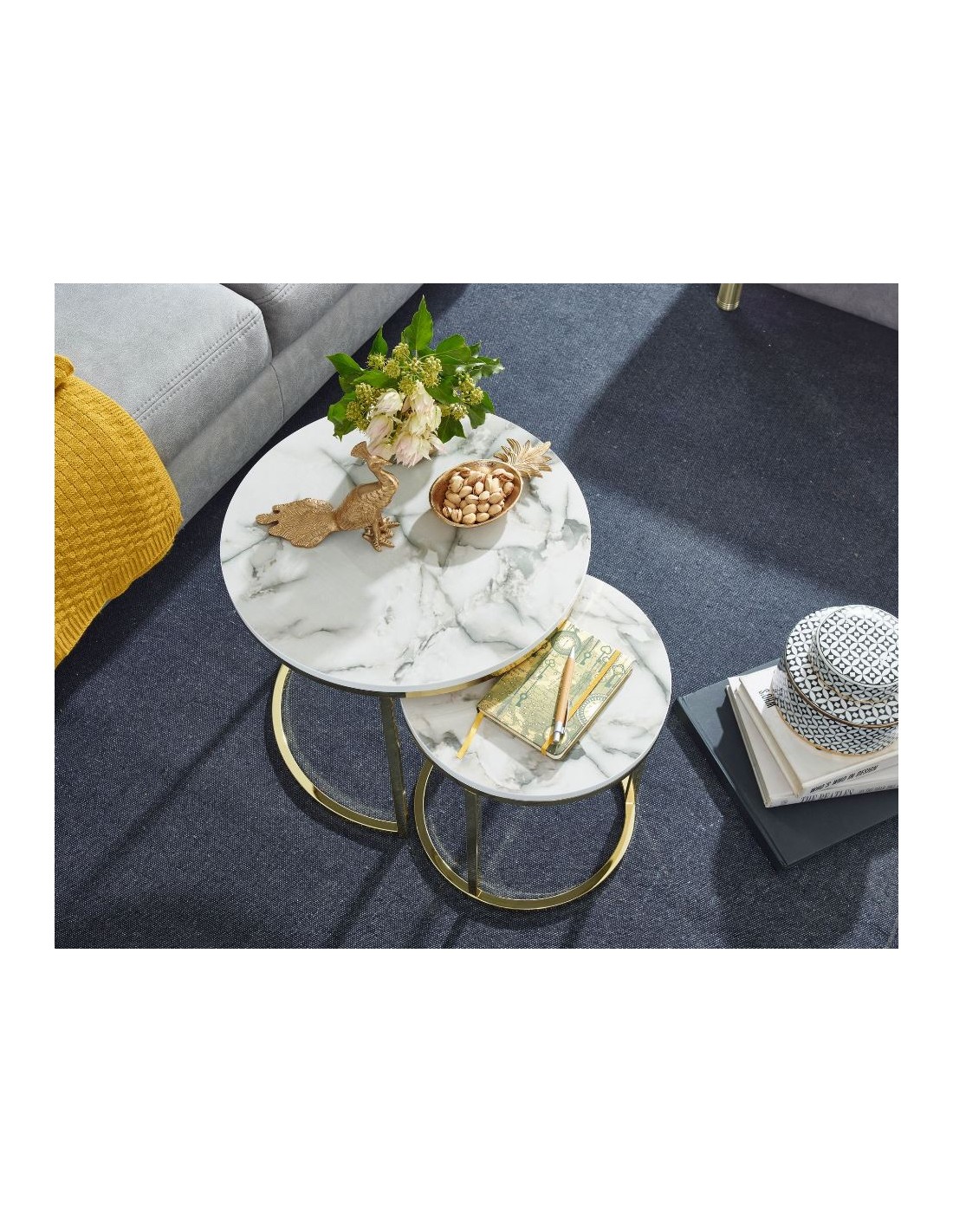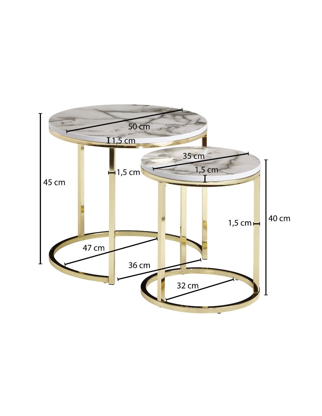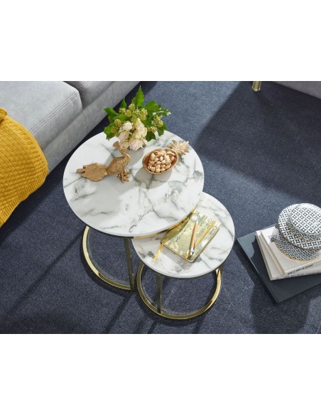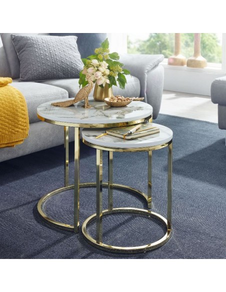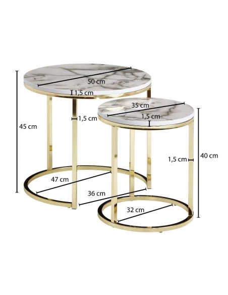 Sæt med 2 sofaborde, fremstillet i guldfarvet metal og marmoriseret hvid mdf. Bordene måler 35 + 50 cm i diameter og 40 + 45 cm i højden.