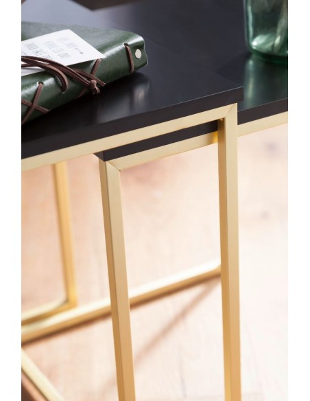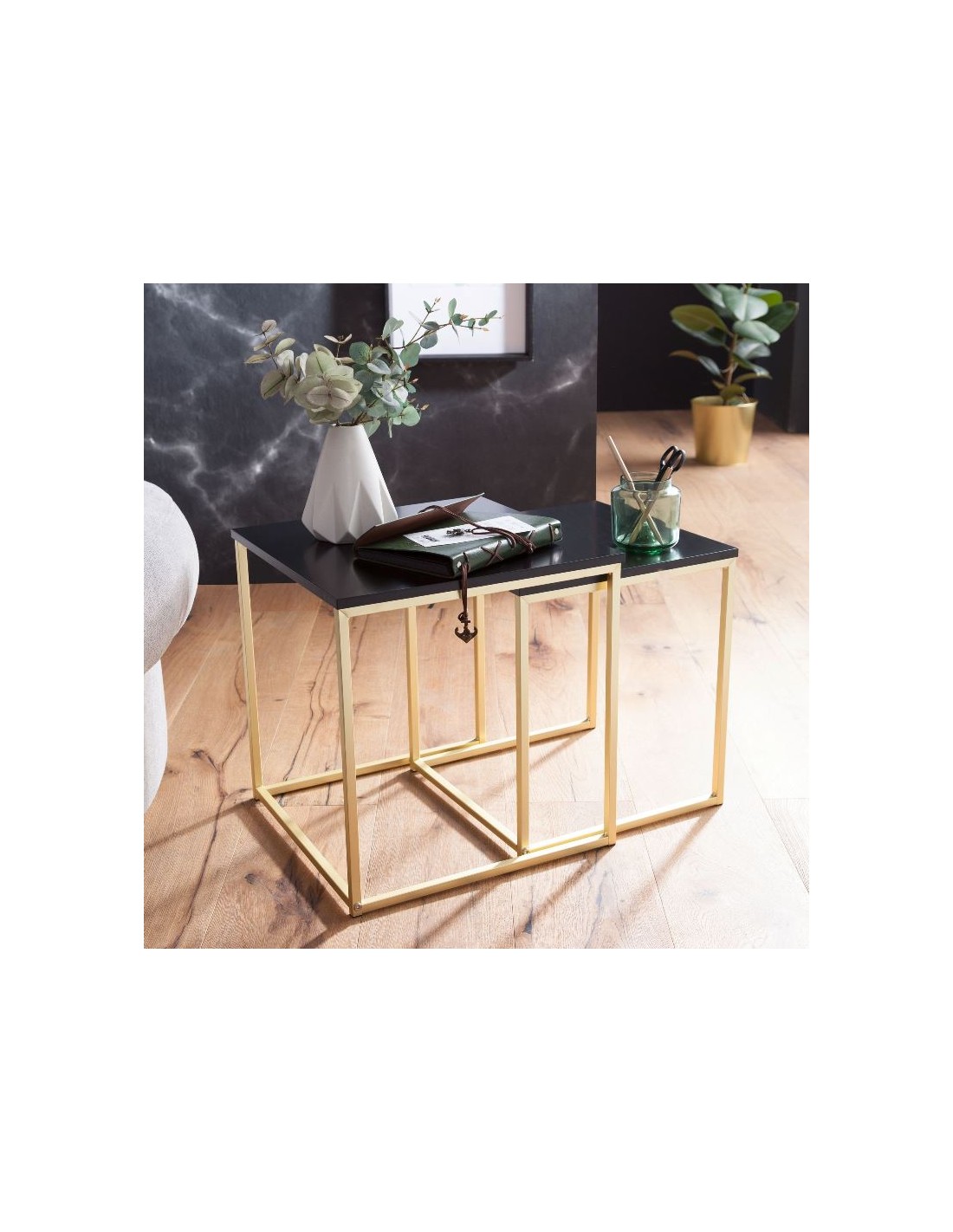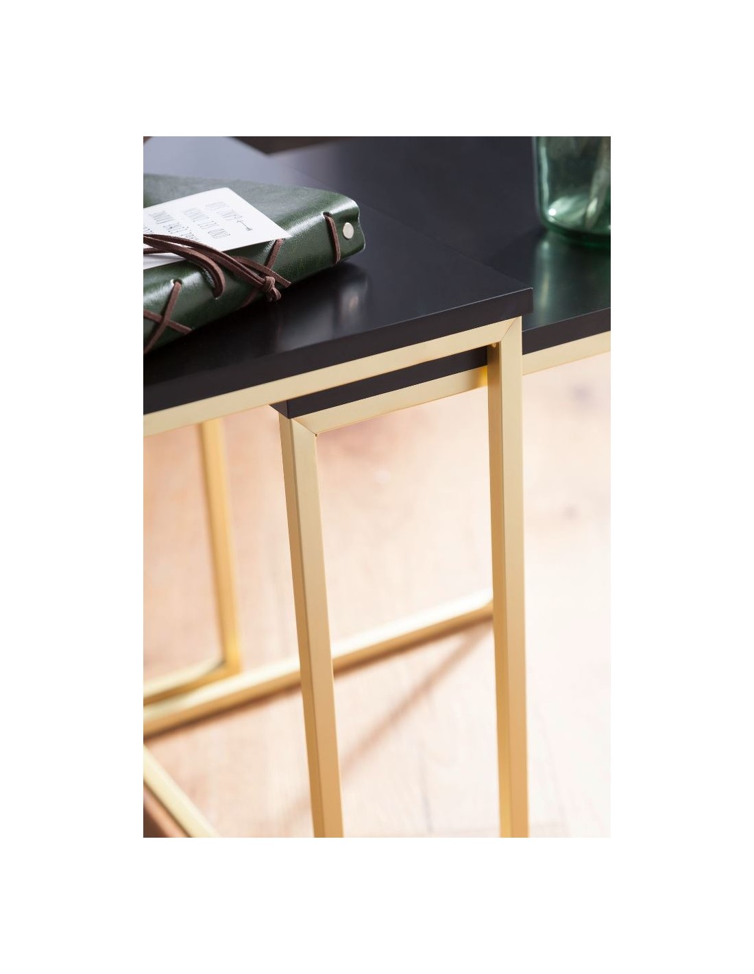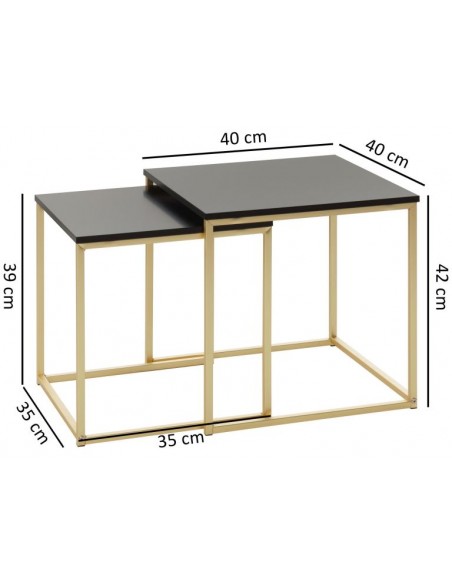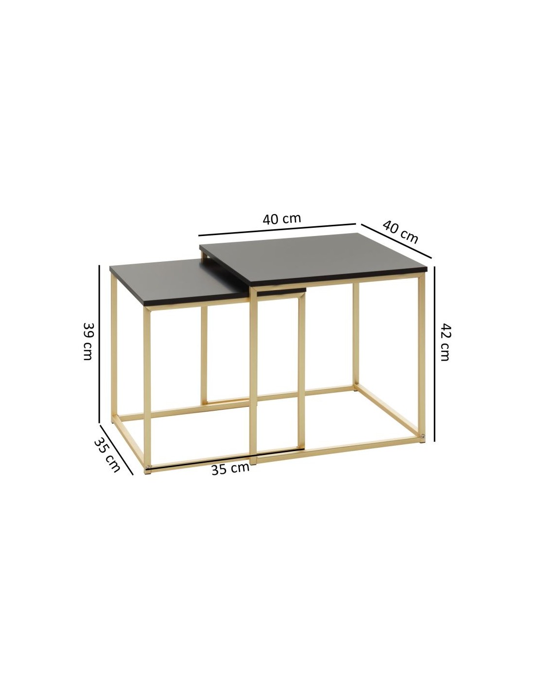 Sæt med 2 sofaborde, fremstillet i guldfarvet metal og sortlakeret mdf. Bordene måler 35 x 35 + 40 x 40 cm i bredde og dybde og 39 + 42 cm i højden.