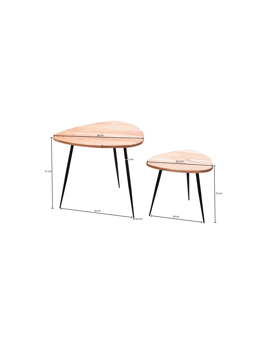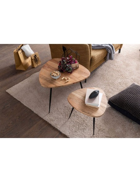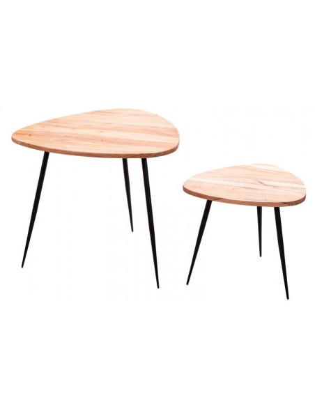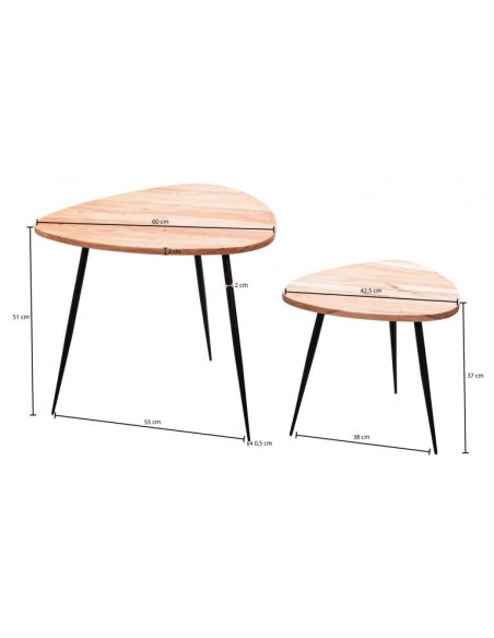 Sæt med 2 sofaborde, fremstillet i sortlakeret metal og naturfarvet akacietræ. Bordene måler 42,5 + 60 cm i diameter og 37 + 51 cm i højden.