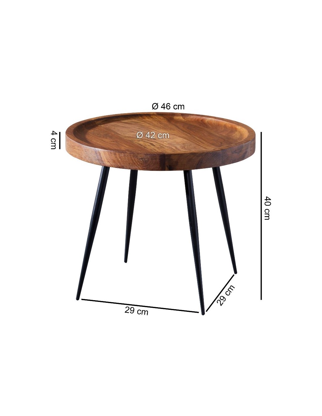 Sofabord fremstillet i sortlakeret metal og brunlakeret sheeshamtræ. Bordet måler 40 cm i højden og 46 cm i diameter.