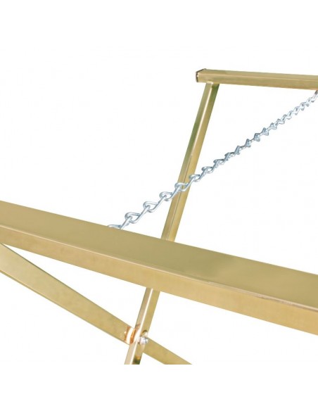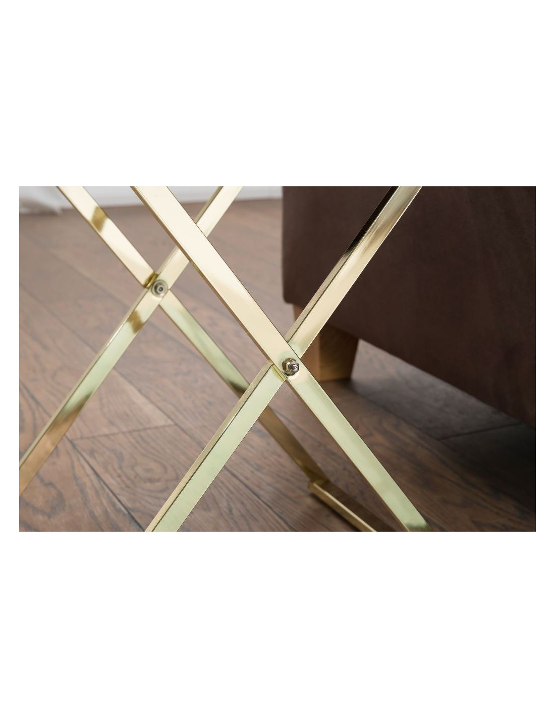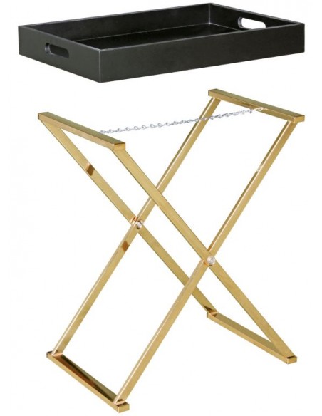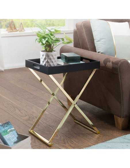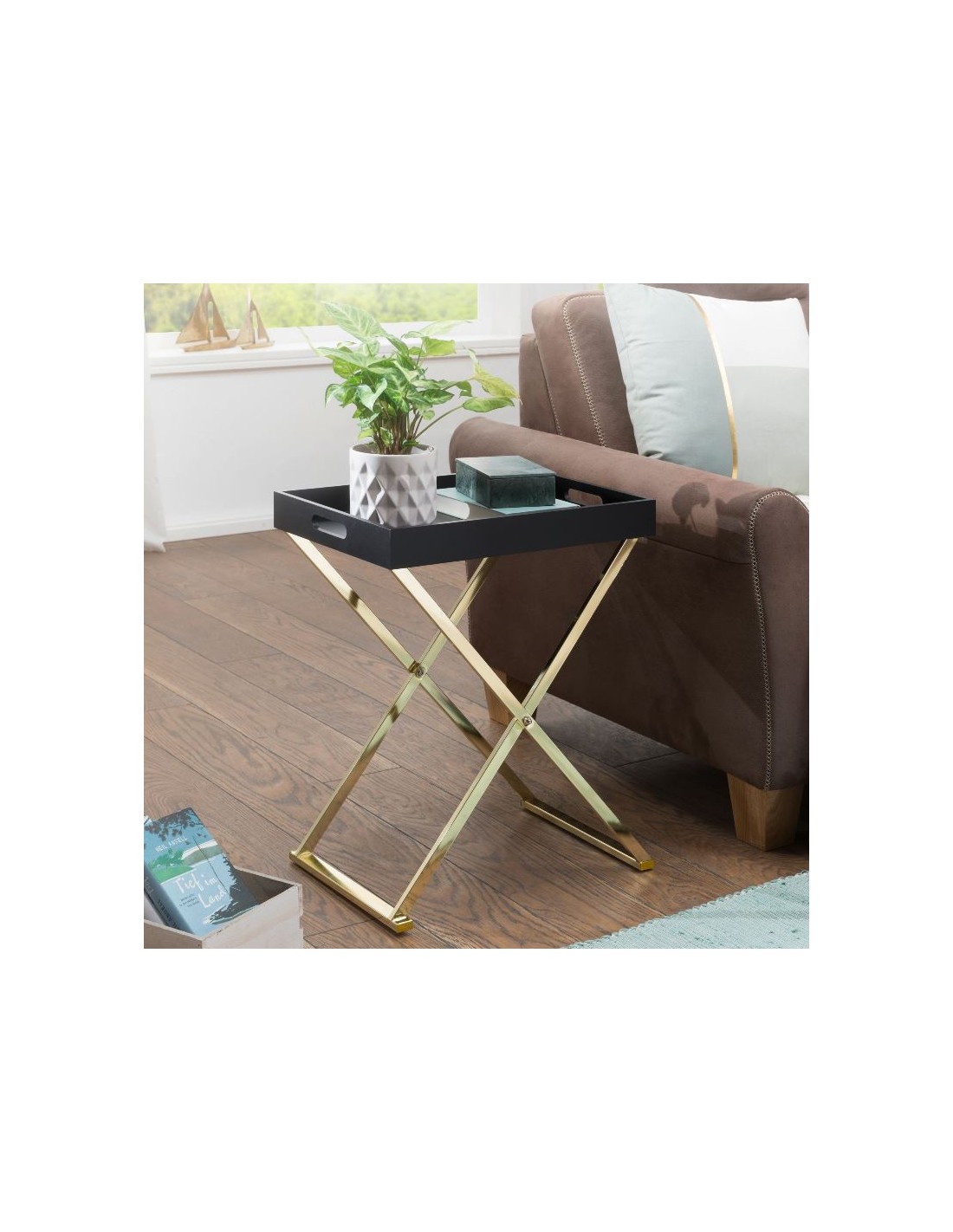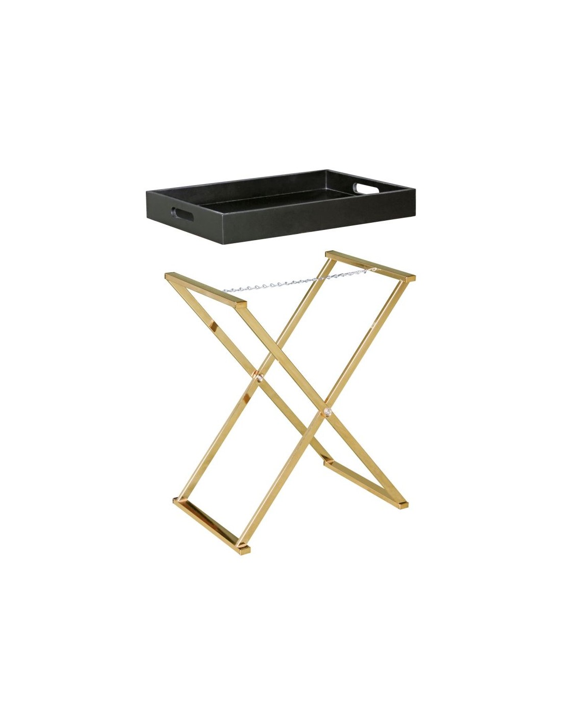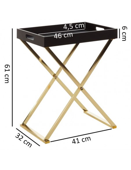 Sofabord fremstillet i guldfarvet metal og sortlakeret mdf. Bordet måler 48 x 34 cm i bredde og dybde og 61 cm i højden. Bakken kan tages af stellet og stellet er sammenklappeligt.