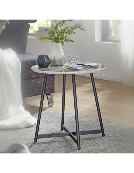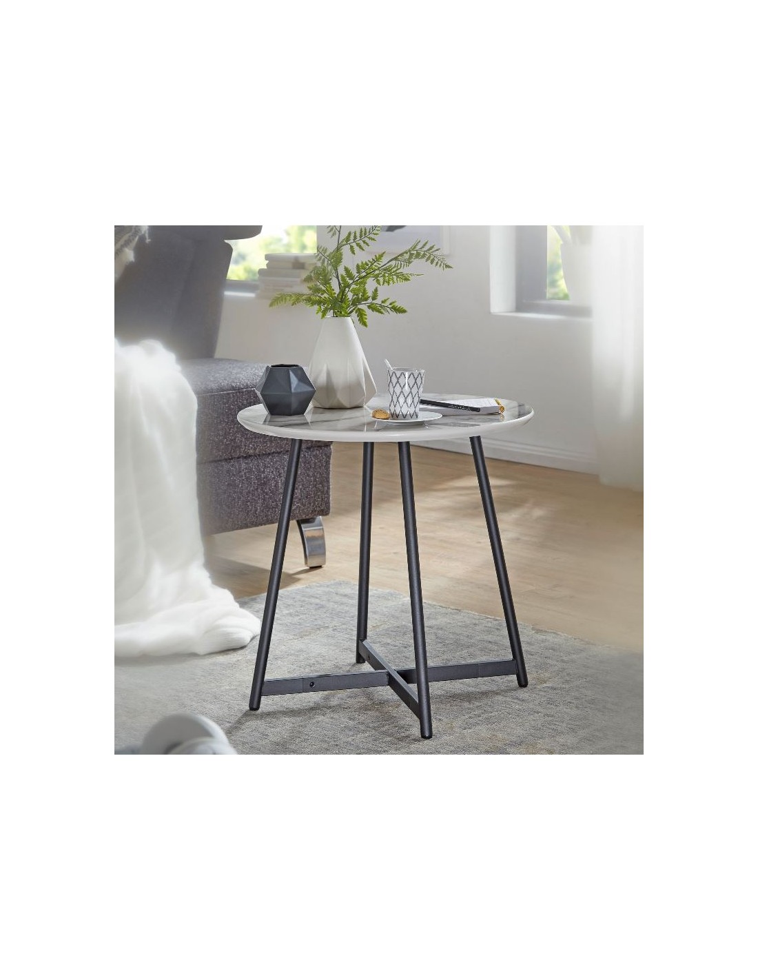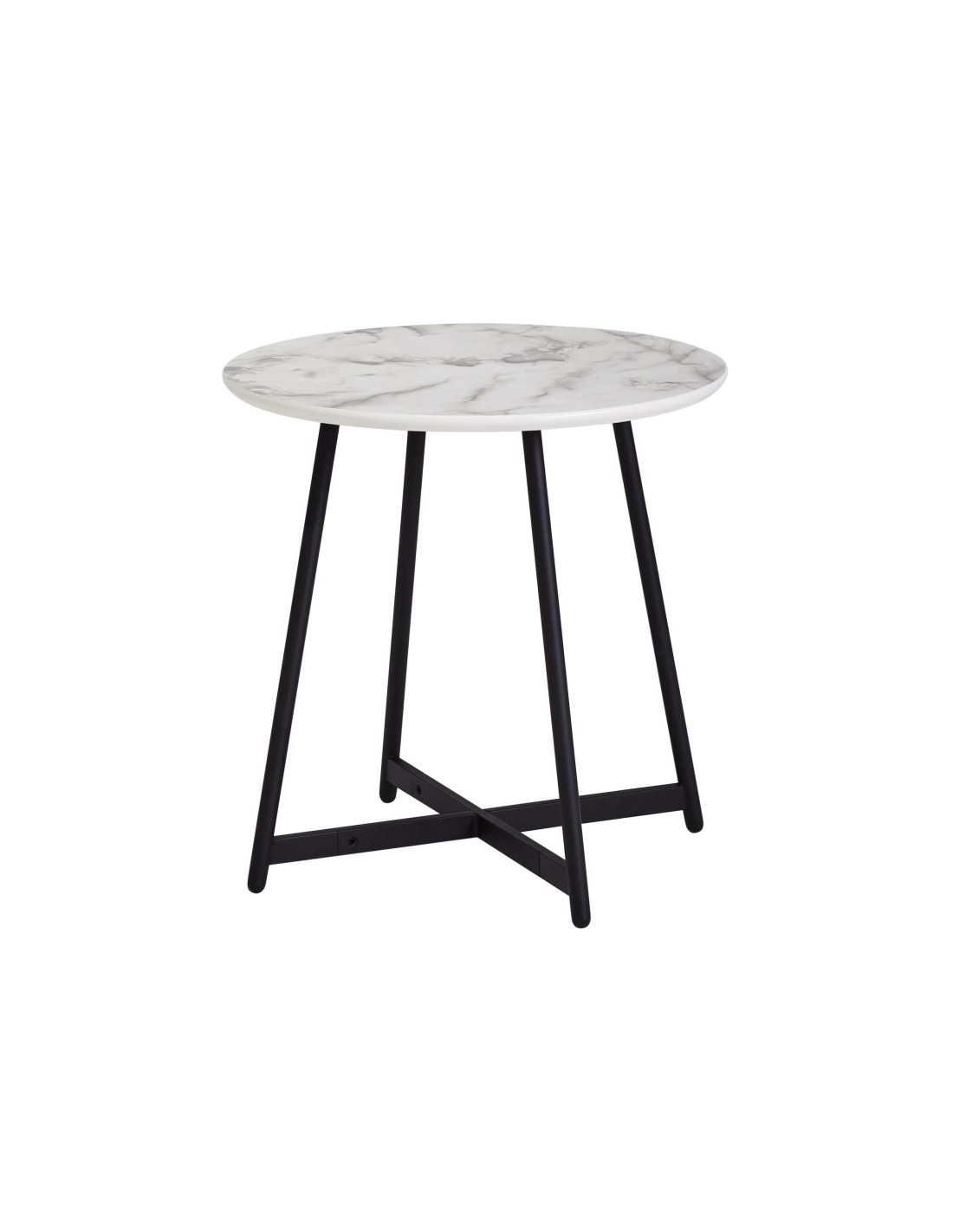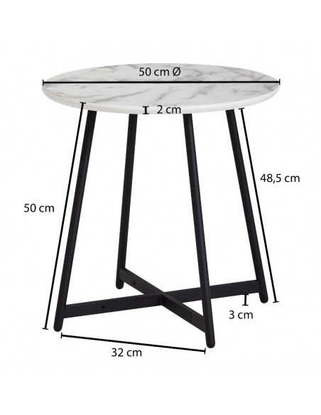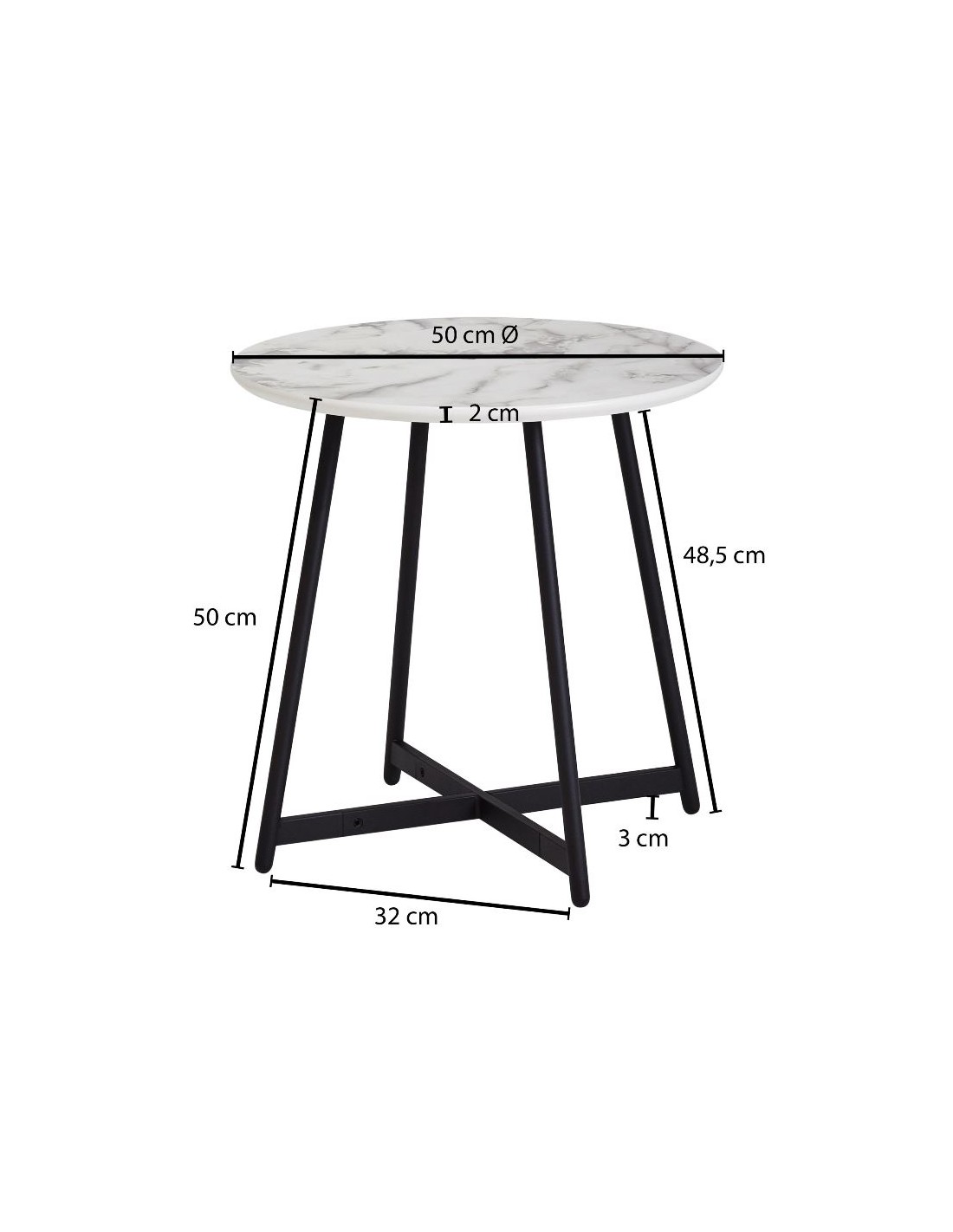 Sofabord fremstillet i sortlakeret metal og marmoriseret hvid mdf. Bordet måler 48,5 cm i højden og 50 cm i diameter.
