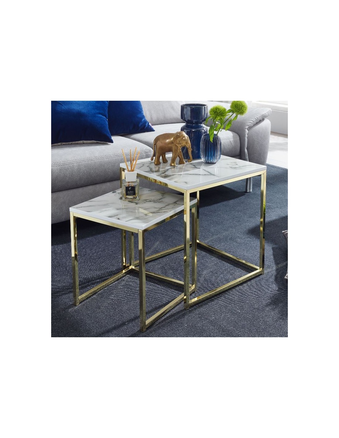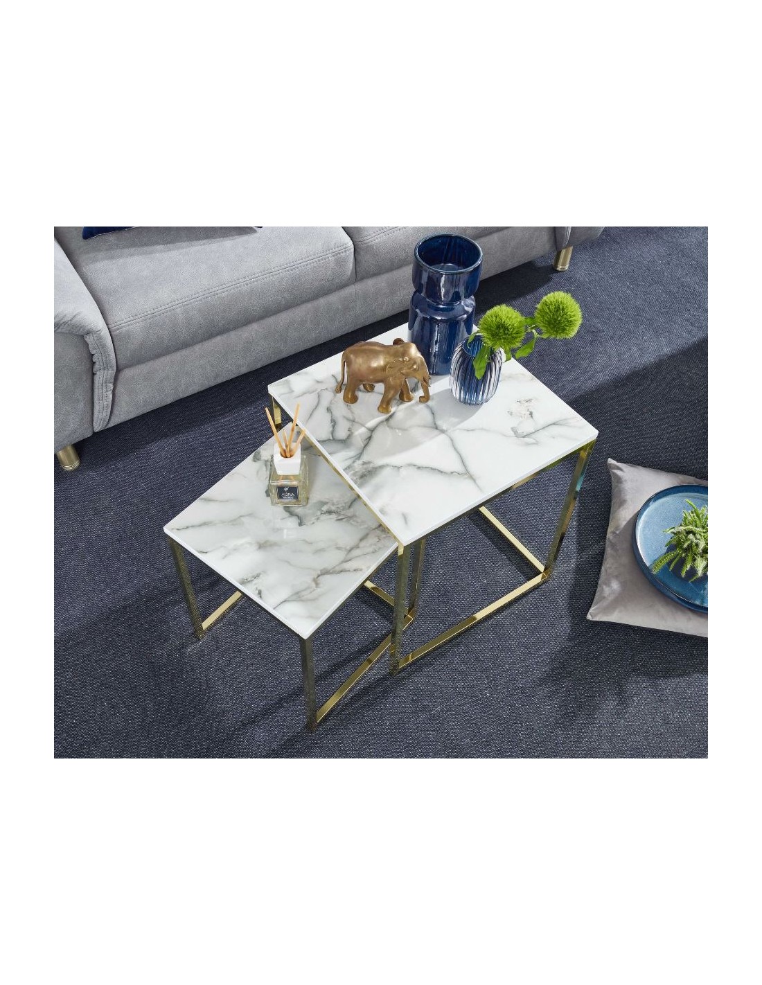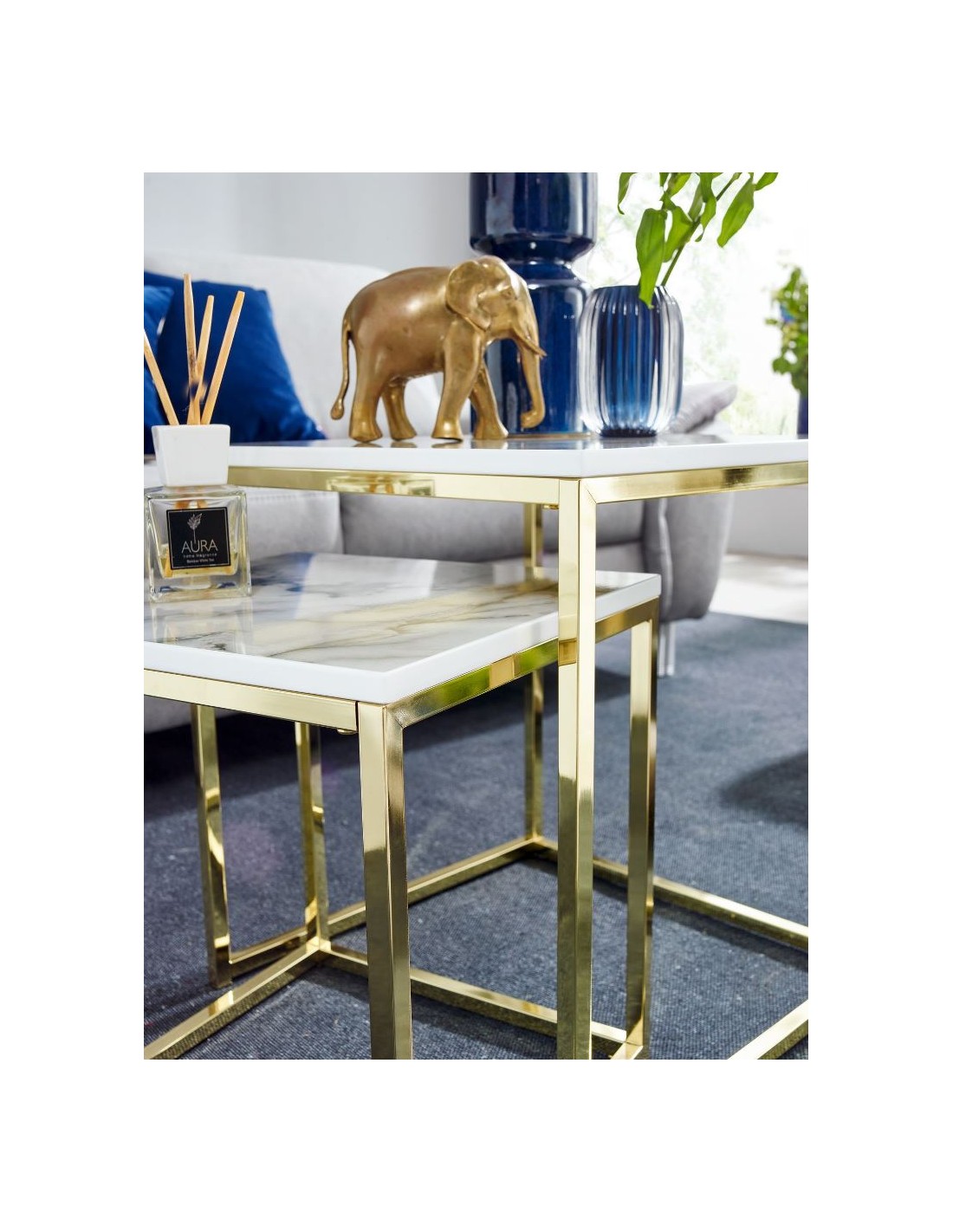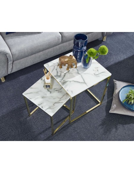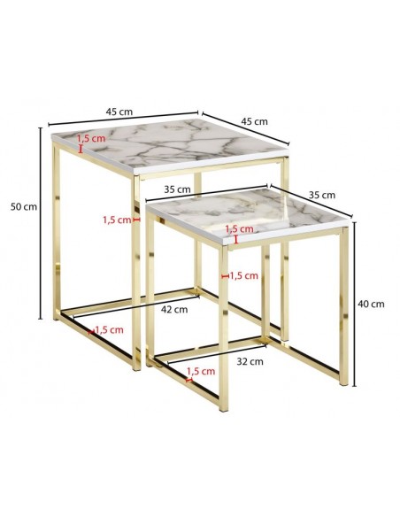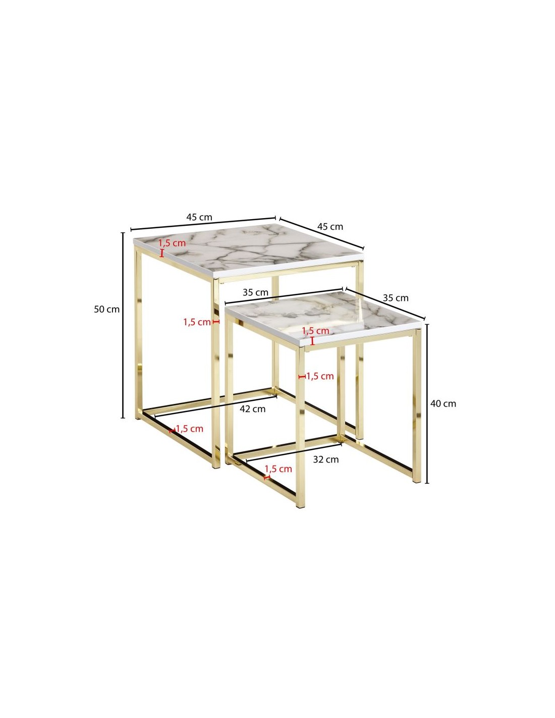 Sæt med 2 sofaborde, fremstillet i guldfarvet metal og marmoriseret hvid mdf. Bordene måler 35 x 35 + 45 x 45 cm i bredde og dybde og 40 + 50 cm i højden.