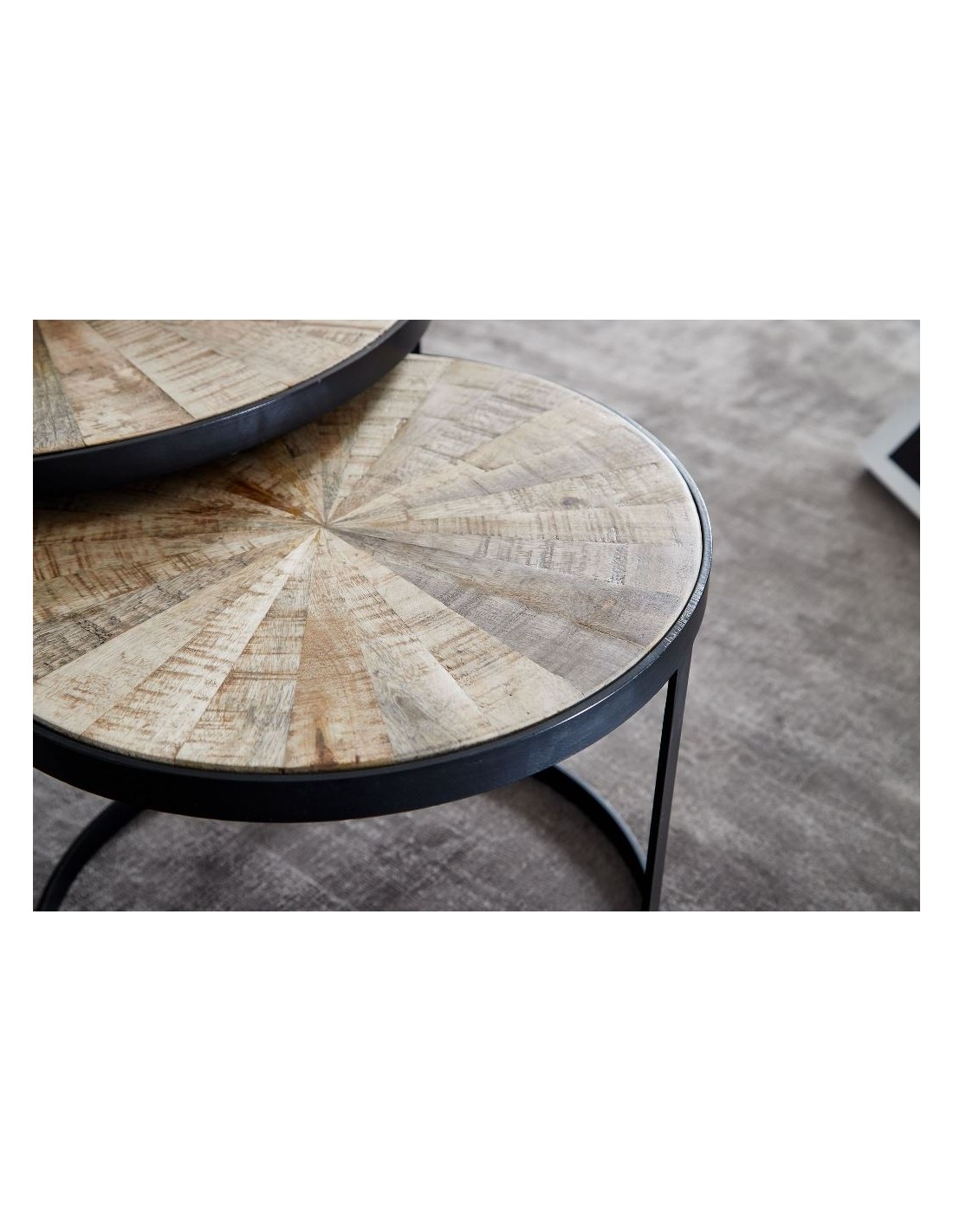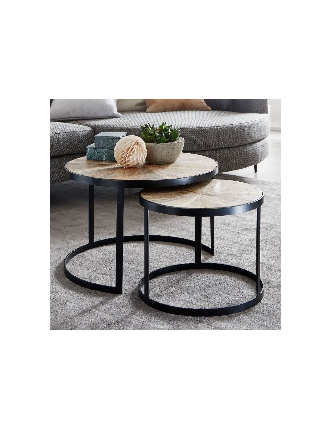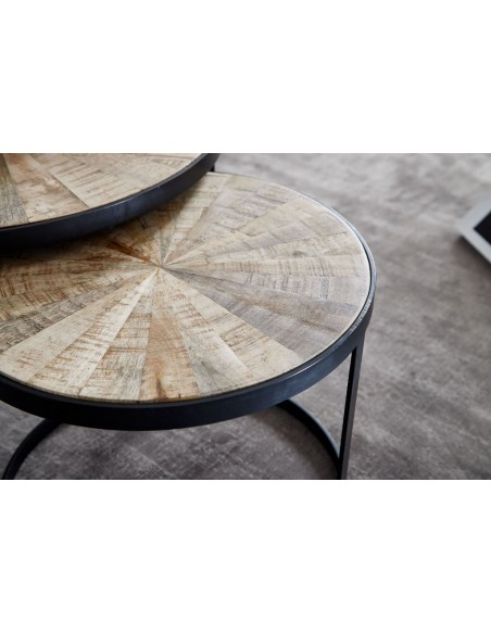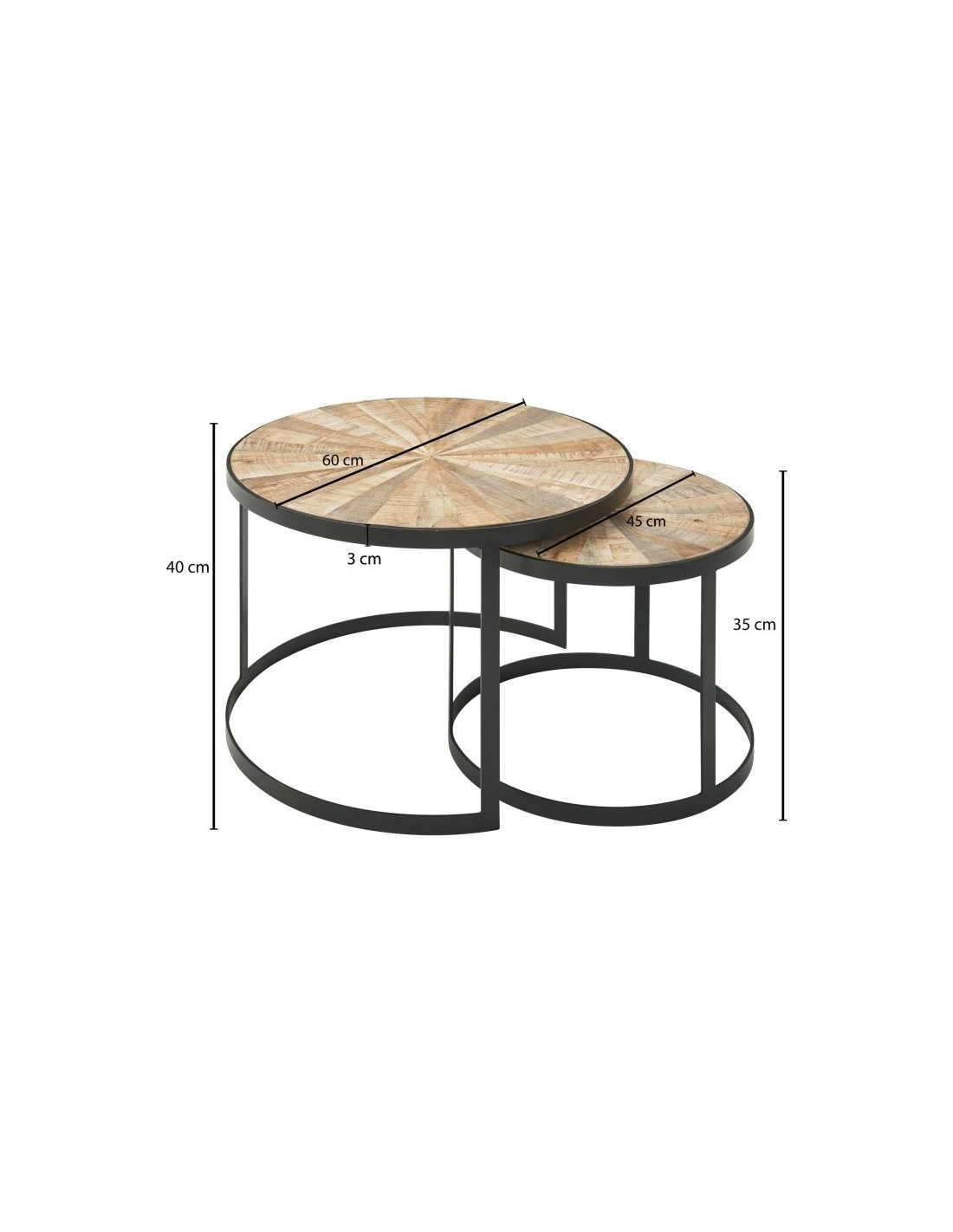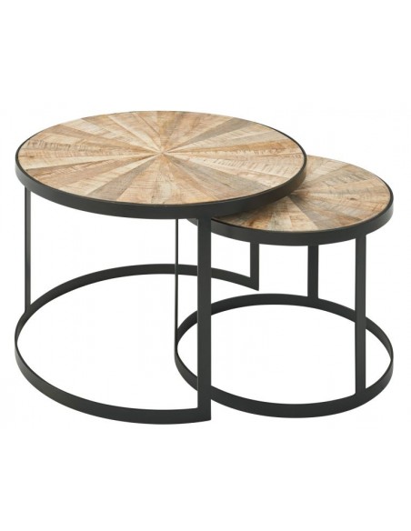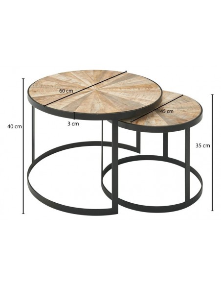 Sæt med 2 sofaborde, fremstillet i sortlakeret metal og naturfarvet akacietræ. Bordene måler 45 + 60 cm i diameter og 35 + 40 cm i højden.