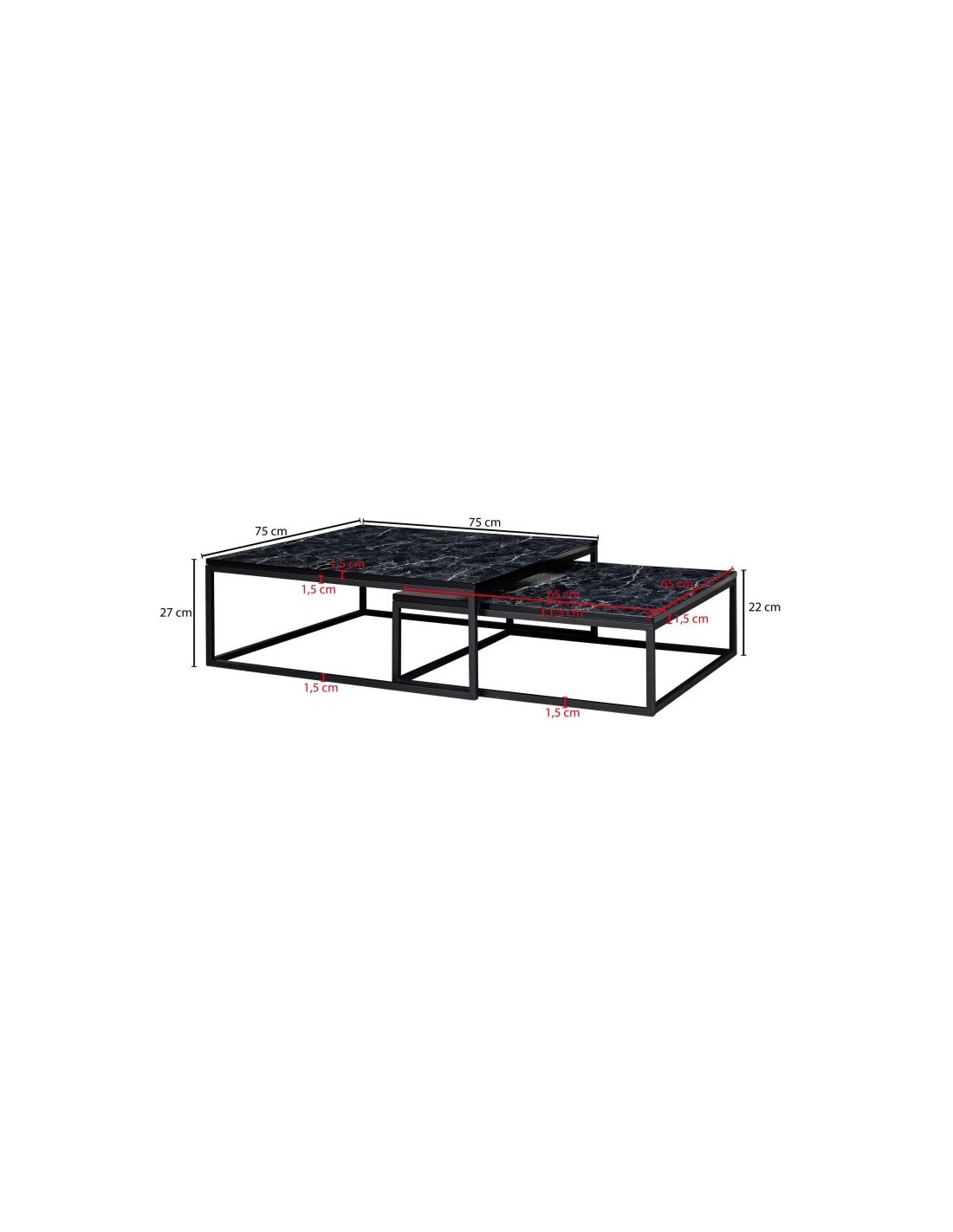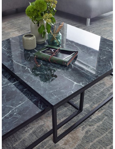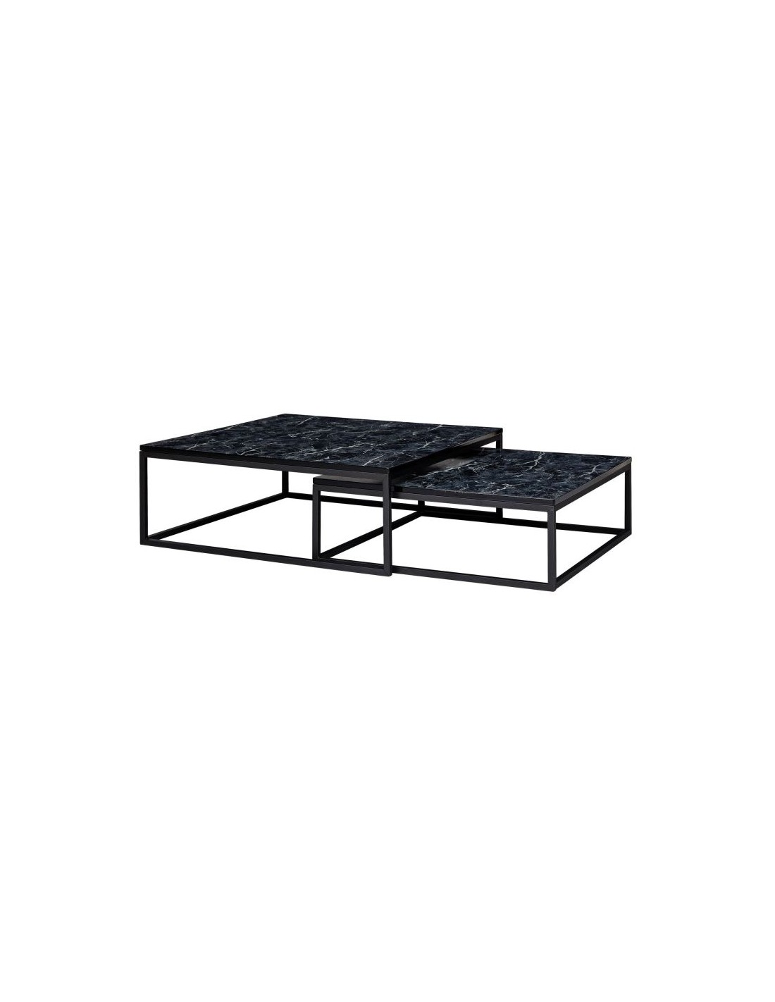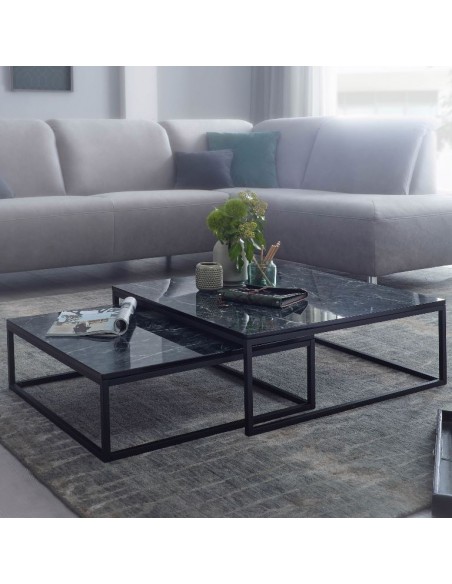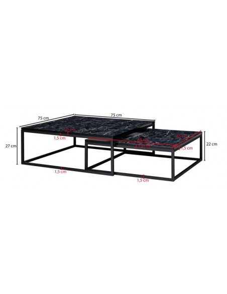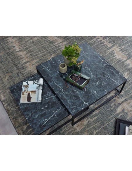Sæt med 2 sofaborde, fremstillet i sortlakeret metal og marmoriseret sort mdf. Bordene måler 65 x 65 + 75 x 75 cm i bredde og dybde og 22 + 27 cm i højden.