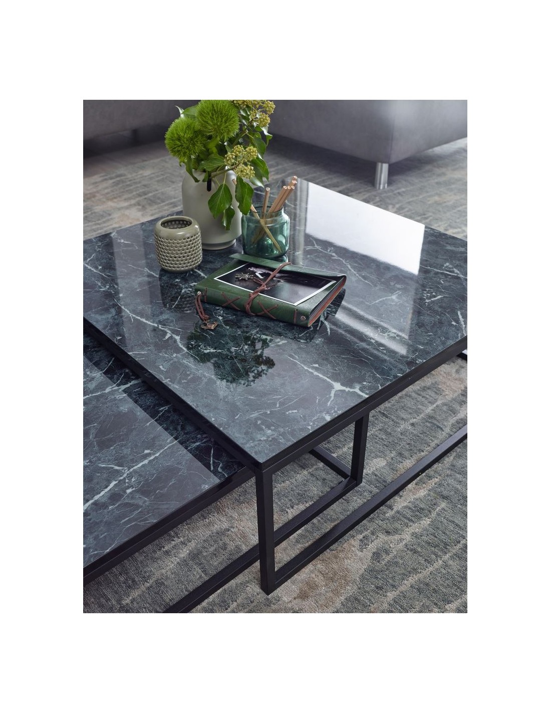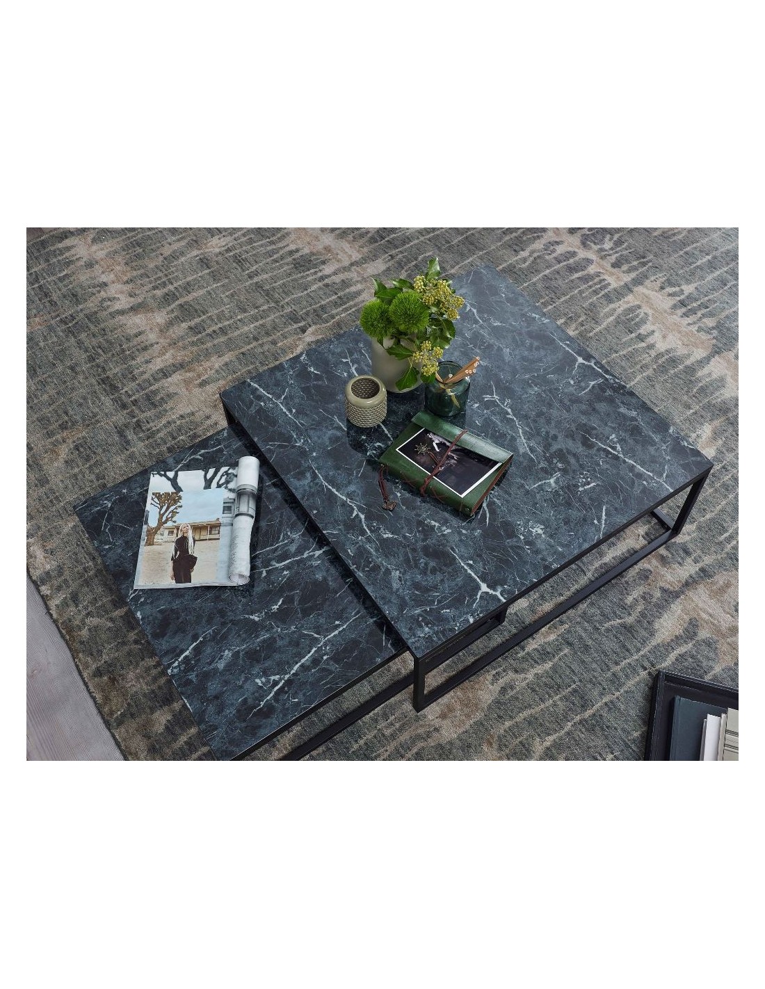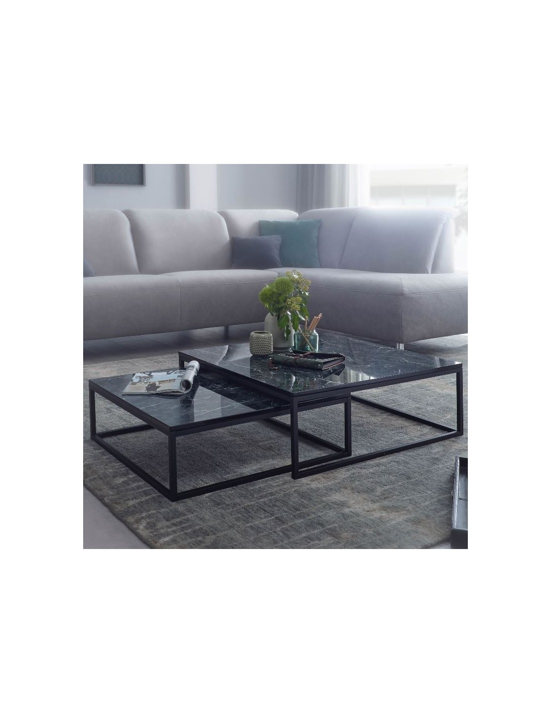 Sæt med 2 sofaborde, fremstillet i sortlakeret metal og marmoriseret sort mdf. Bordene måler 65 x 65 + 75 x 75 cm i bredde og dybde og 22 + 27 cm i højden.