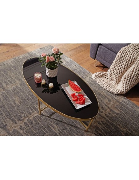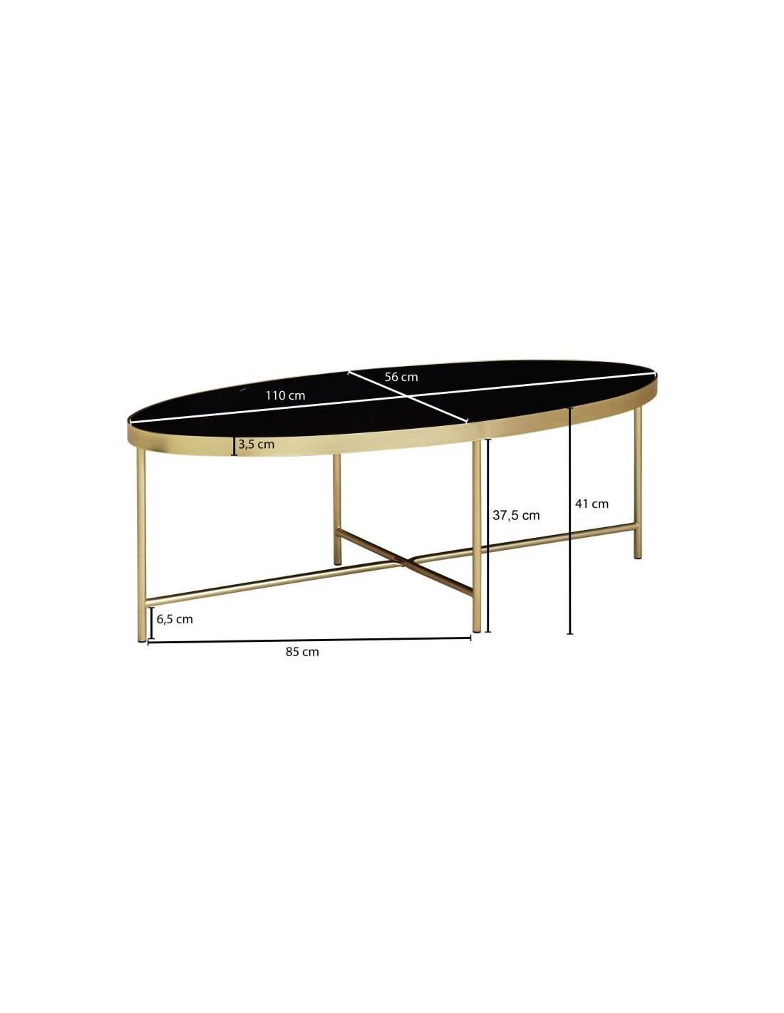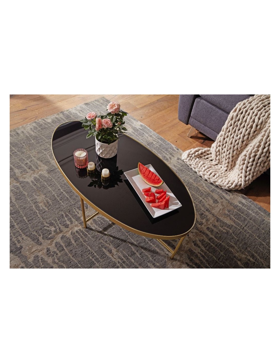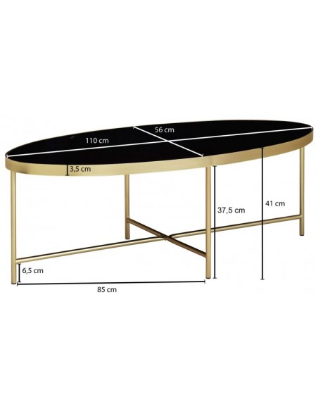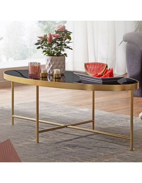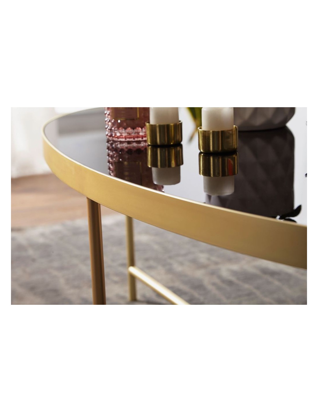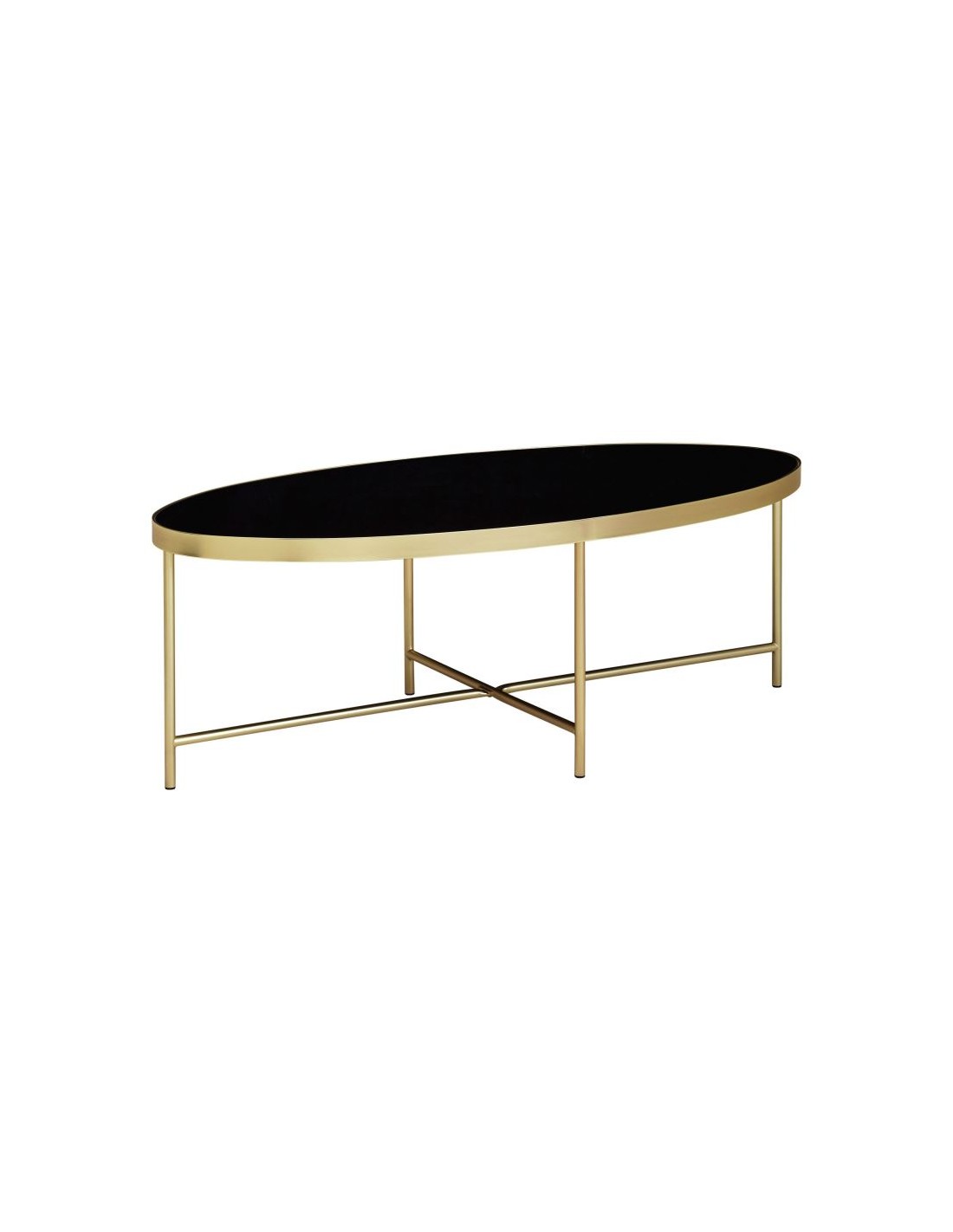 Sofabord fremstillet i guldfarvet metal og spejl sort glas. Bordet måler 41 cm i højden og 110 x 56 cm i bredde og dybde.