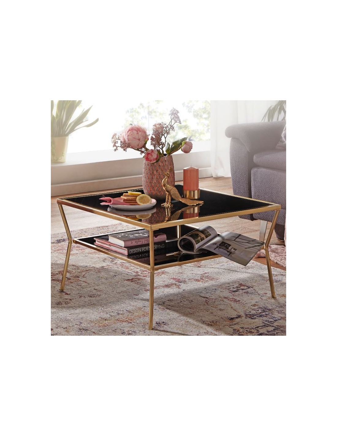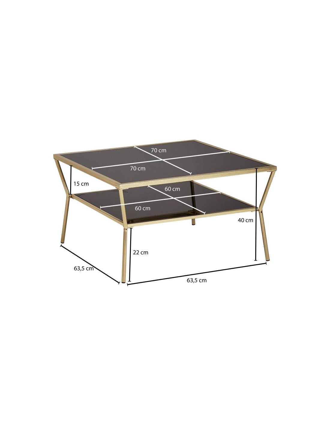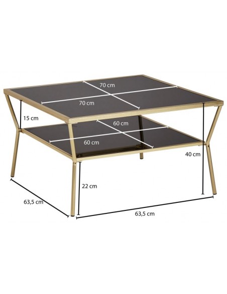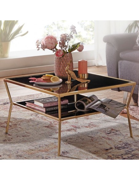 Sofabord fremstillet i guldfarvet metal og spejl sort glas. Bordet måler 40 cm i højden og 70 x 70 cm i bredde og dybde.